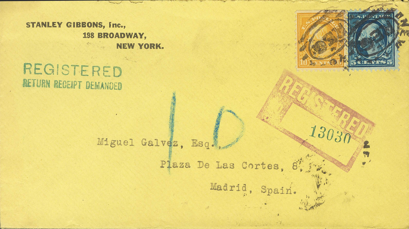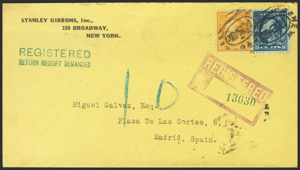 Yvert 203, 208. 1917. 5 ctvos azul y 10 ctvos naranja. Certificado de NUEVA YORK a MADRID. Matasello oval NEW YORK / REG y en el frente membrete STANLEY GIBBONS INC, al dorso llegada. MAGNIFICA.