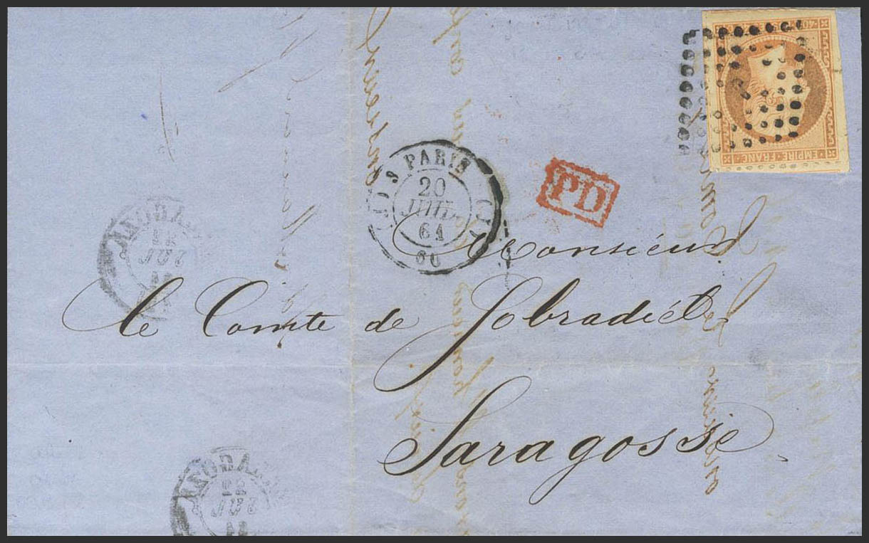 Yvert 23. 1861. 40 cts naranja dentado "Perce" (en lineas). PARIS a ZARAGOZA. Matasello ROMBO DE PUNTOS "J". MAGNIFICA Y RARA.