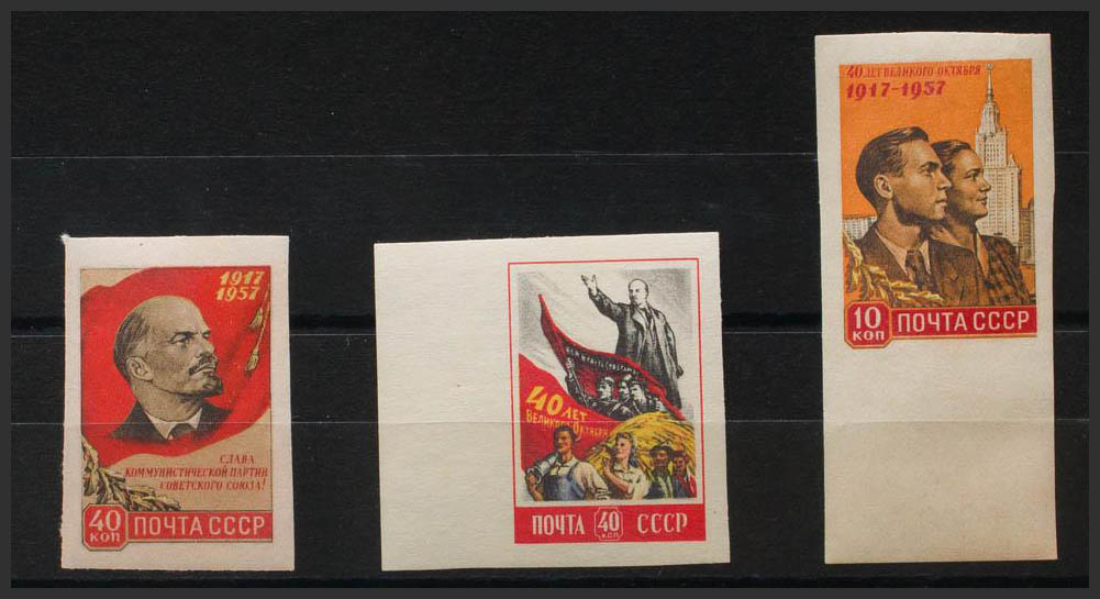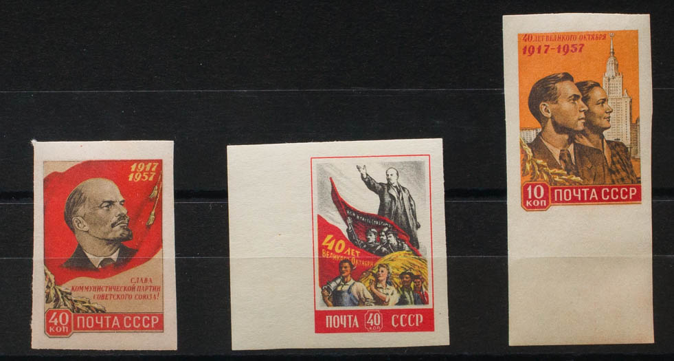 ★★Yvert 1990a, 1991a, 1992a. 1957. 10 k multicolor, 40 k multicolor y 40 k multicolor (Lenin). SIN DENTAR. MAGNIFICOS.