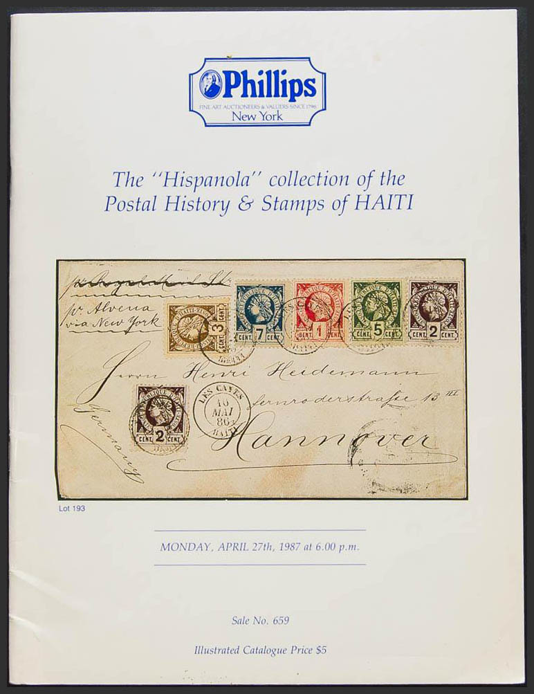 1987. Catálogo THE "HISPANOLA" COLLECTION OF THE POSTAL HISTORY AND STAMPS OF HAITI, celebrada el 27 de Abril de 1987. Phillips, sale Nº659. Nueva York, 1987.