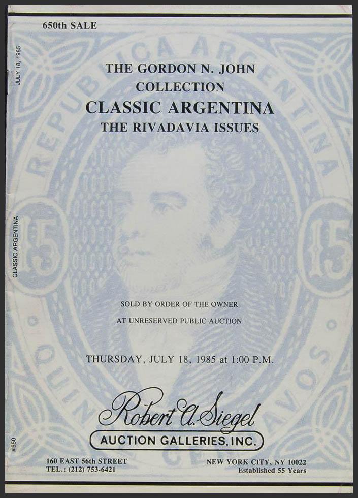 1985. Catálogo de la colección THE GORDON N.JOHN COLLECTION CLASSIC ARGENTINA THE RIVADAVIA ISSUES, celebrada el 18 de Julio de 1985. Robert Siegel. Nueva York, 1985.