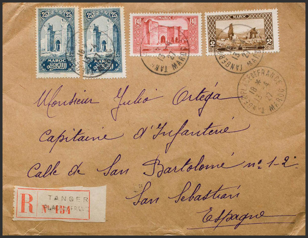 Yvert 106(2), 118, 120. 1927. 25 cts azul, dos sellos, 1´40 f rosa carmÃn y 2 f sepia. Certificado de TANGER a SAN SEBASTIAN. Al dorso tránsito por Madrid. MAGNIFICA.