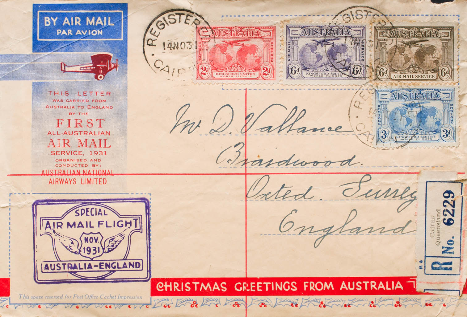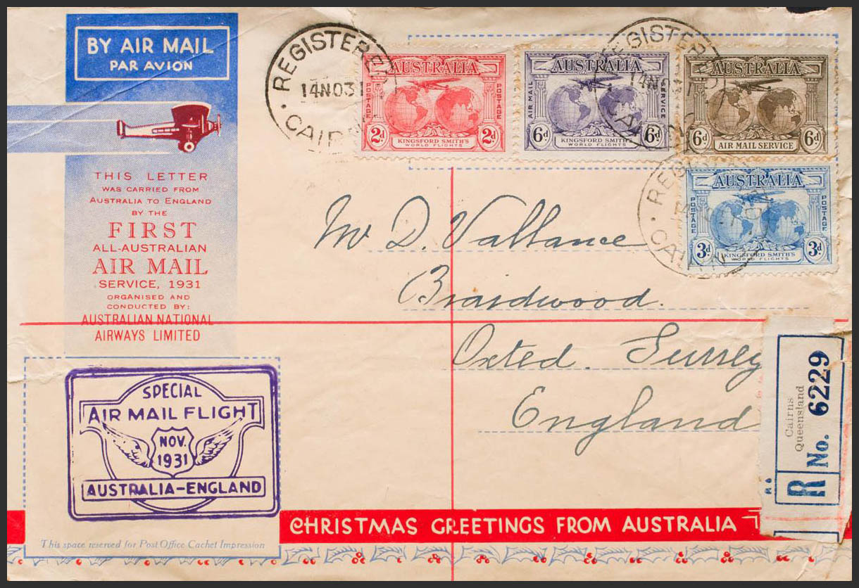 Yvert 75/76, Aéreo 3, 4. 1931. Serie completa, 6 p castaño y 6 p violeta. Certificado de CAIRNS a OXTED (GRAN BRETAÑA). En el frente marca SPECIAL / AIR MAIL FLIGHT / AUSTRALIA / ENGLAND, en violeta y llegada al dorso. MAGNIFICA Y RARA CON LOS CUATRO SELLOS DE LA SERIE DE 1931.