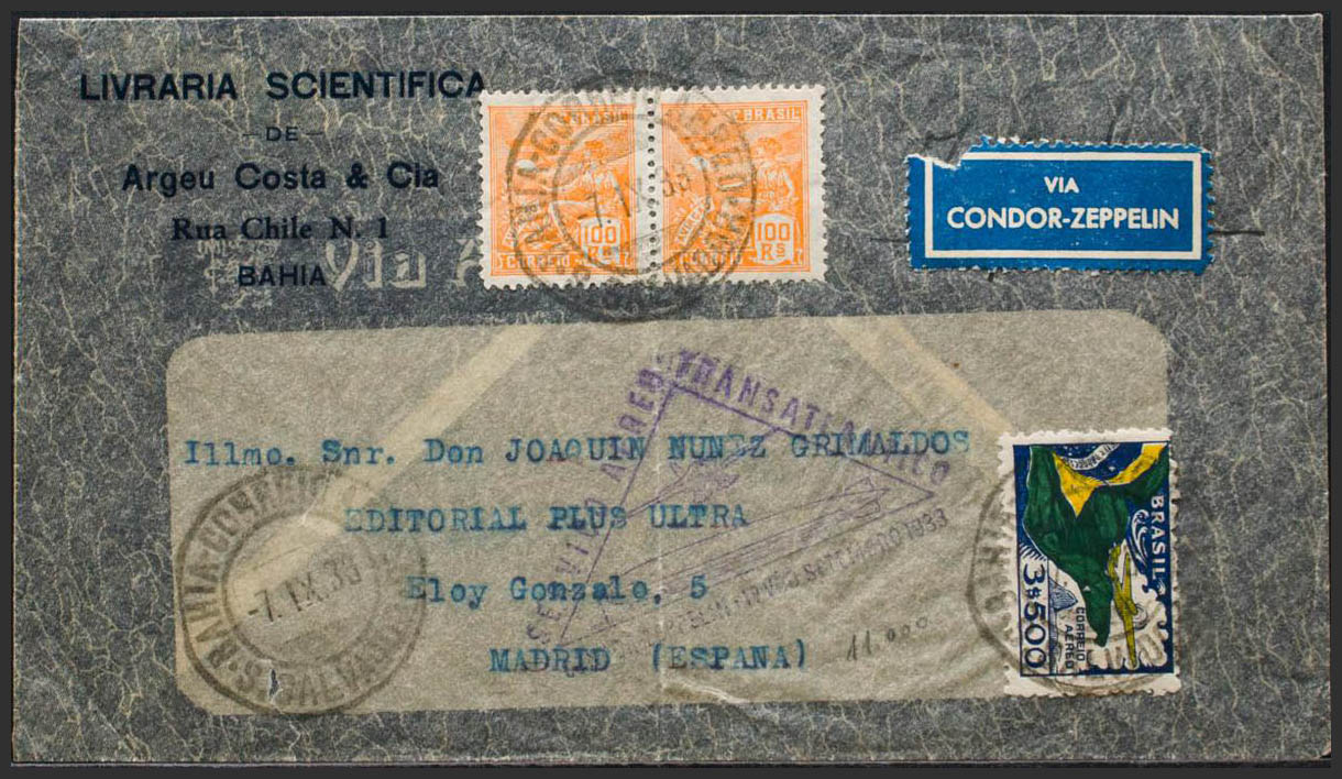 Yvert 170(2), Aéreo 31. 1933. 100 reis naranja, dos sellos y 3500 reis azul, verde y amarillo. Correo Aéreo de SAN SALVADOR DE BAHIA a MADRID. En el frente marca SERVIÇIO AEREO TRANSATLANTICO / CONDOR-ZEPPELIN-19 VOO SETTEMBRO 1933, en violeta. MAGNIFICA.