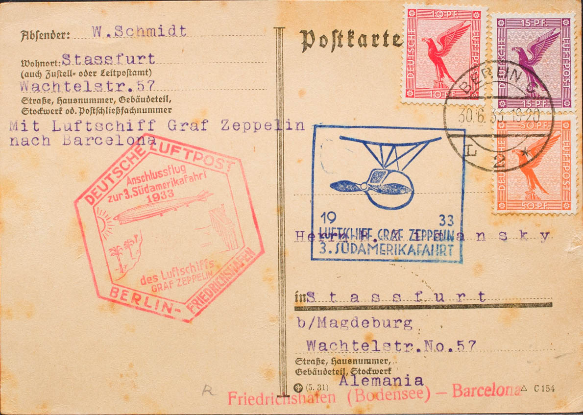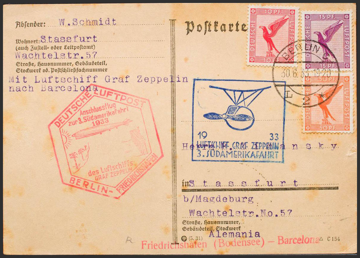 Yvert 28, 29, 31. 1933. 10 p rojo, 15 p lila y 50 p castaño. Graf Zeppelin de BERLIN a STASSFURT (manchitas del tiempo). En el frente marcas del Graf Zeppelin DEUTSCHE LUFTPOST / BERLIN FRIEDRICHSHAFEN, en rojo y LUFTSCHIFF GRAF ZEPPELIN / 3. SUDAMERIKAFAHRT, en azul y al dorso tránsito por Barccelona. BONITA Y RARA.