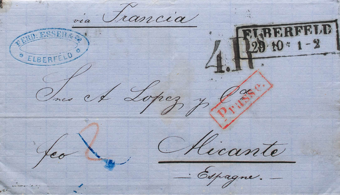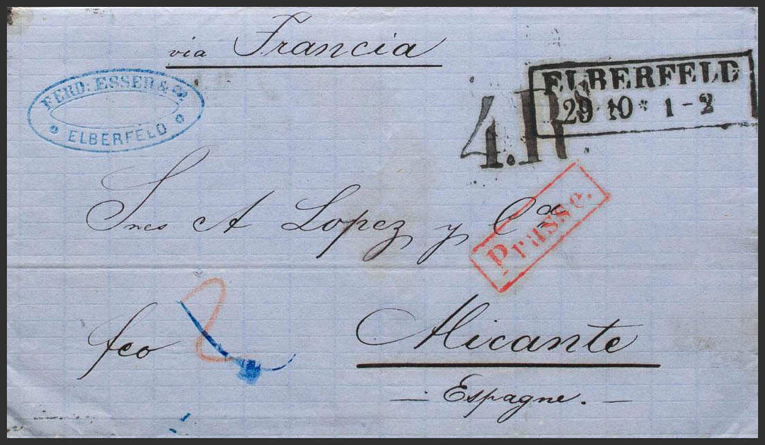 1861. ELBERFELD a ALICANTE. Marcas ELBERFELD, en negro, PRUSSE, en rojo y porteo "4 Rs" (reales), aplicado a la entrada y en tránsito por La Junquera. MAGNIFICA.