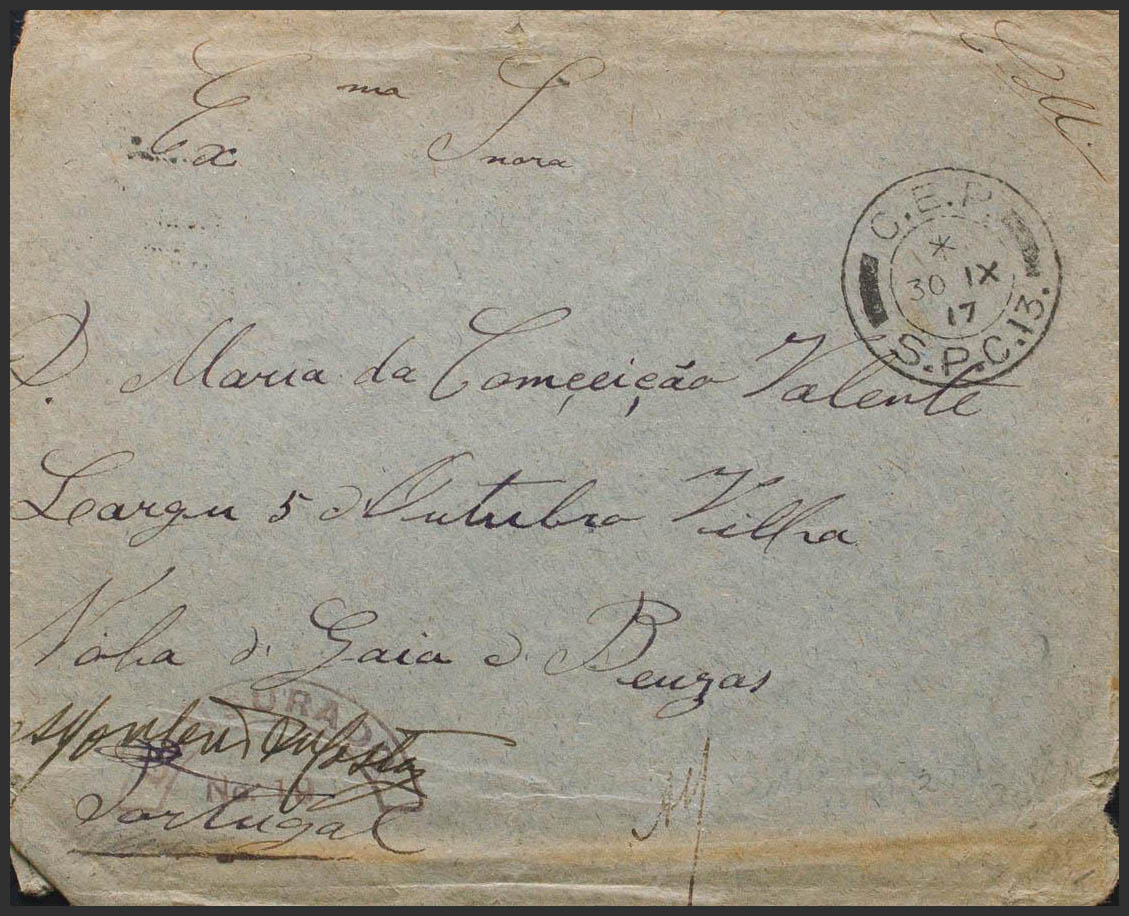 1917. Dirigida a VILA NOVA DE GAIA. Fechador C.E.P. / S.P.C. 13 del CORPO ESPEDICIONARIO PORTUGUES, enviado a Francia para luchar contra Alemania y marca CENSURADO / Nº19, al dorso llegada. MAGNIFICA Y RARA.