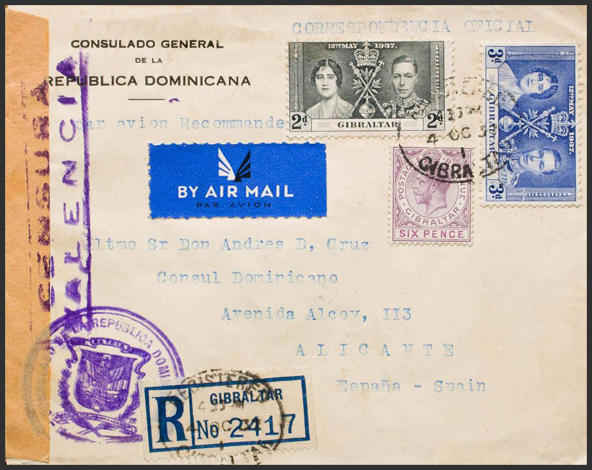 Yvert 100, 101, 79. 1937. 2 p negro, 3 p azul y 6 p violeta. Certificado de GIBRALTAR a ALICANTE. Circulada entre consulados de la Republica Dominicana. MAGNIFICA.