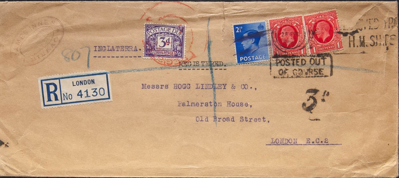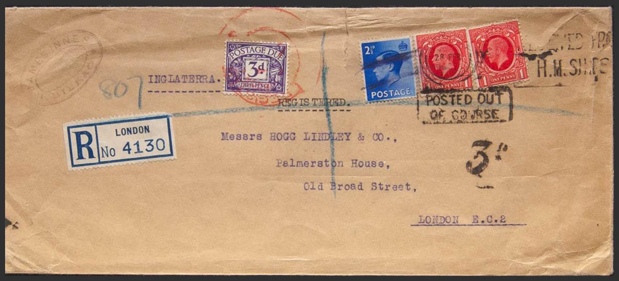 1937. 1 p rojo, dos sellos y 2½ p ultramar. BILBAO a LONDRES (GRAN BRETAÑA), franqueada y depositada en un buque británico. Tasada a la llegada, aplicando sello de tasa de Gran Bretaña de 3 p violeta y marca POSTED OUT / OF COURSE. BONITA.
