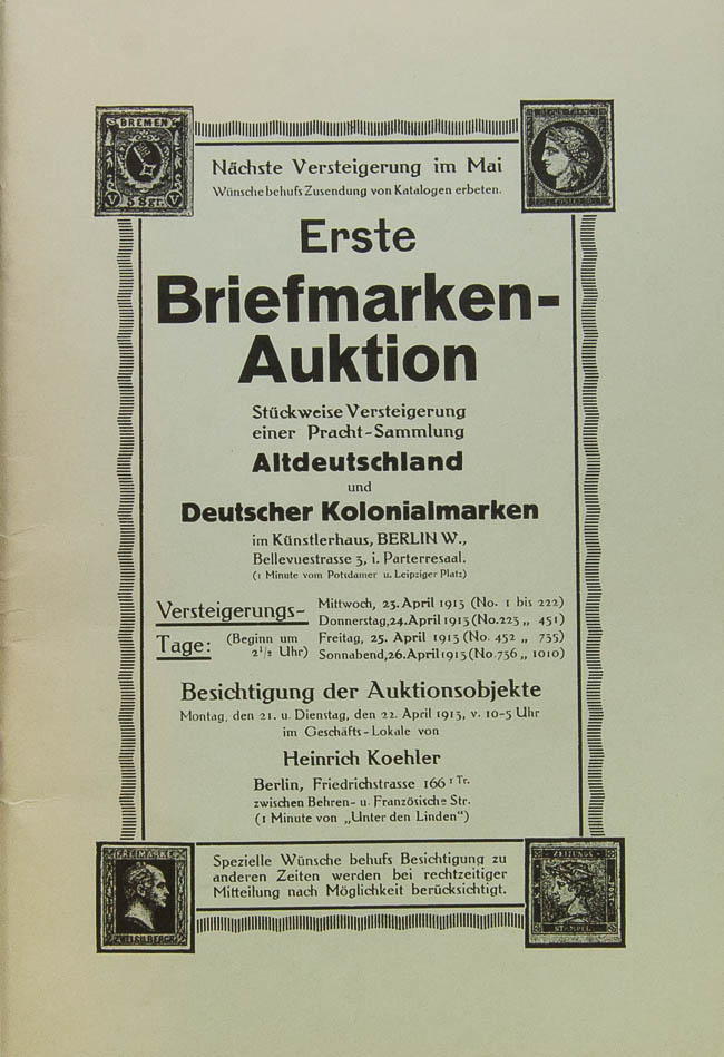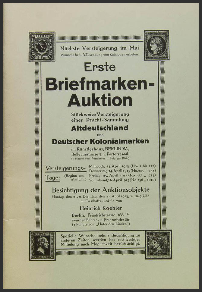 1913. Catálogo reimpreso de la subasta ALDEUTSCHLAND UND DEUTSCHER KOLONIALMARKEN, celebrada del 23 al 26 de Abril de 1913, incluye precios de adjudicación. 1ª Subasta de Auktion Heinrich Koehler. Wiesbaden, 1986.