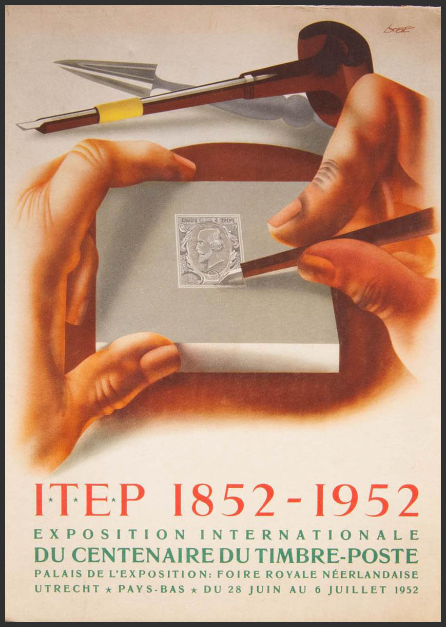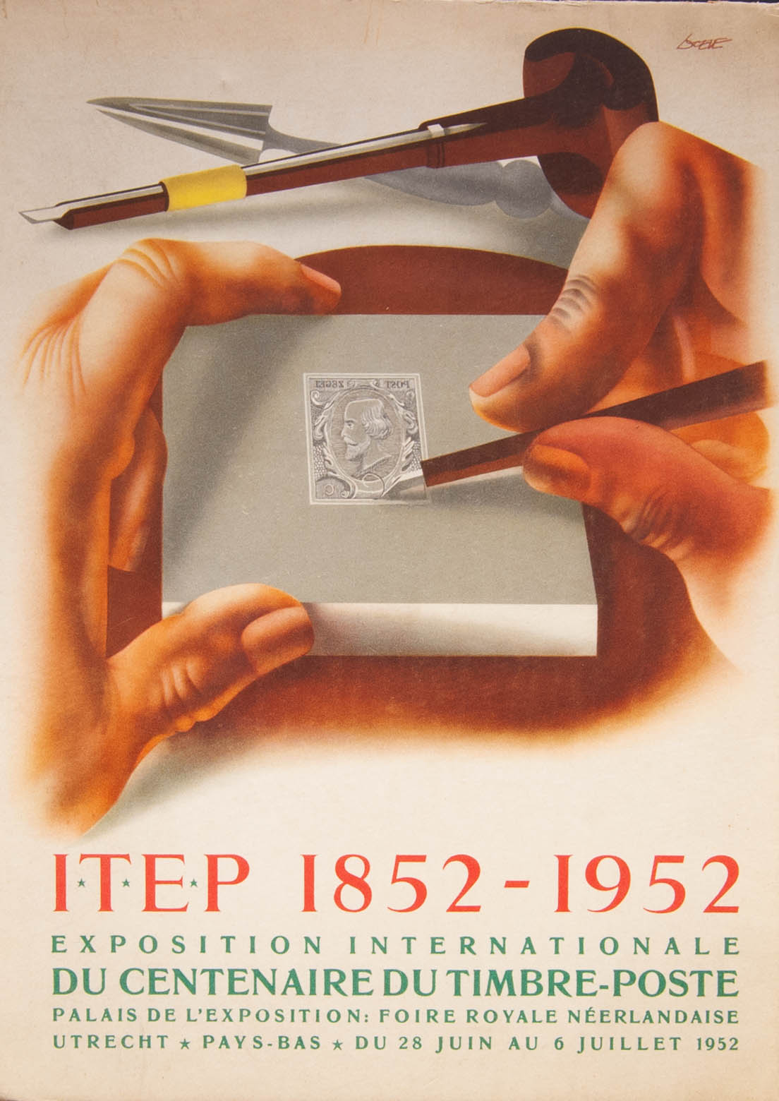 1952. Cartel original de la Exposición Filatélica EXPOSITION INTERNACIONALE DU CENTENAIRE DU TIMBRE-POSTE I.T.E.P. 1852-1952, celebrada en Utrech del 28 de Junio al 3 de Julio de 1952. MAGNIFICO Y RARO. (papel cartón 196 mm x 275 mm).