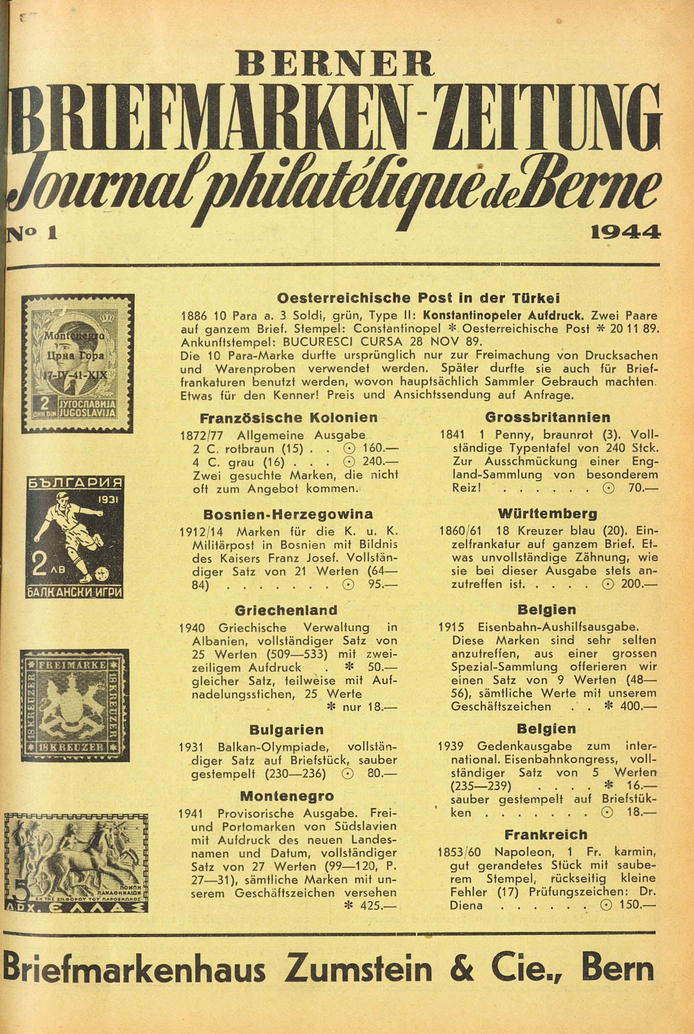 (1944ca). Conjunto de ocho volúmenes encuadernados de la revista filatélica BERNER, BRIEFMARKEN-ZEITUNG (1944-1952), se corresponde con la actual casa Zumstein. Berna 1944ca.