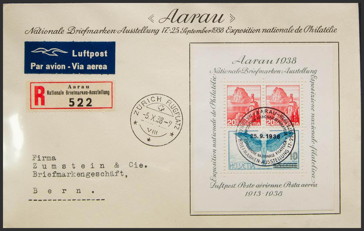 Yvert 4. 1938. Hoja bloque Aarau 1938. Certificado de AARAU a BERNA. Al dorso llegada. MAGNIFICA.