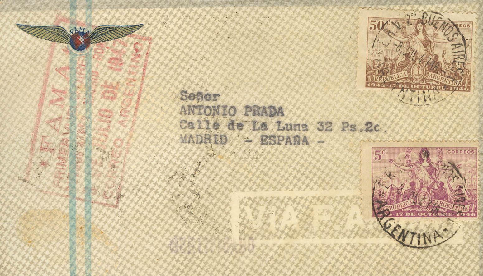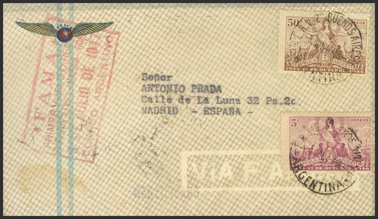 477(7), 480. 1947. 5 cts violeta, siete sellos y 50 cts castaño. Certificado de BUENOS AIRES a MADRID. En el frente marca FAMA / PRIMER VUELO DIRECTO / BUENOS AIRES-MADRID-ROMA, en violeta y al dorso llegada. MAGNIFICA Y MUY RARA.
