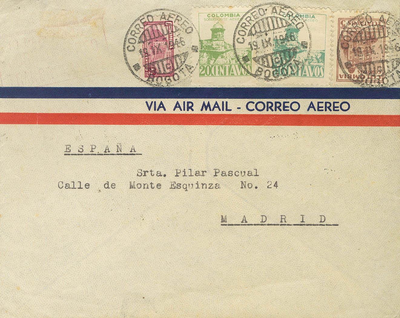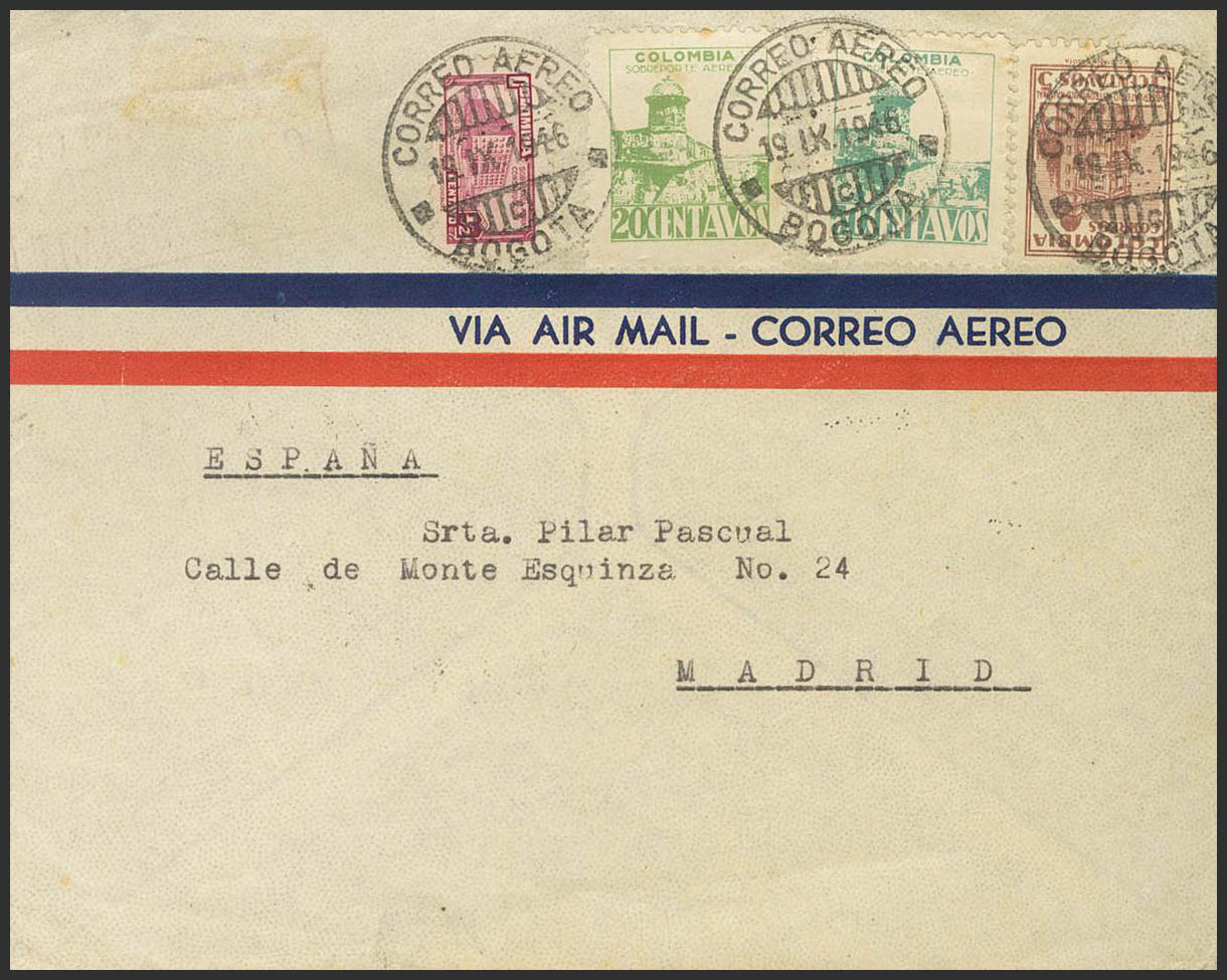 383A, 399, Aereos. 1946. ½ ctvo lila, 5 ctvos castaño lila, 20 ctvos verde y 50 ctvos turquesa. Correo Aéreo de BOGOTA a MADRID. Al dorso marca PRIMER VUELO INTERCONTINENTAL / COLOMBIA-GUAYANA INGLESA-BRASIL / ISLA DE LA ASCENSION-AFRICA-EUROPA, en verde azul y llegada. MAGNIFICA Y RARA.