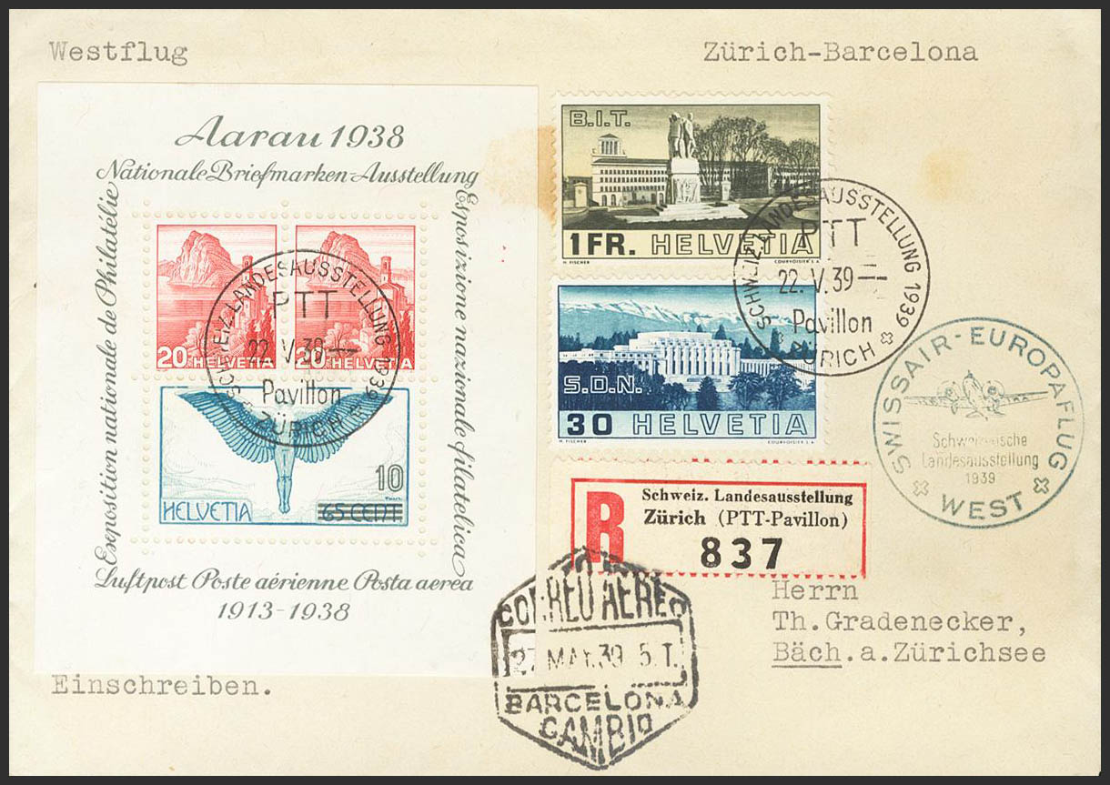 308, 310, HB4. 1939. 30 cts azul, 1 f negro y hoja bloque. Certificado de ZURICH a BÄCH. En el frente marca SWISSAIR-EUROPAFLUG / WEST y tránsito CORREO AEREO / BARCELONA. MAGNIFICA.