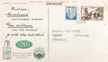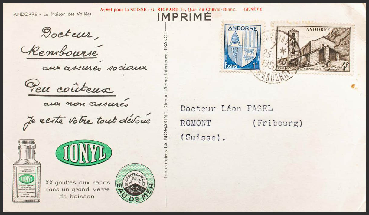 Yvert 119, 122. 1950. 1 f azul y 4 f castaño. Tarjeta Postal (publicitaria) IONYL de ANDORRA a ROMONT (SUIZA). MAGNIFICA.