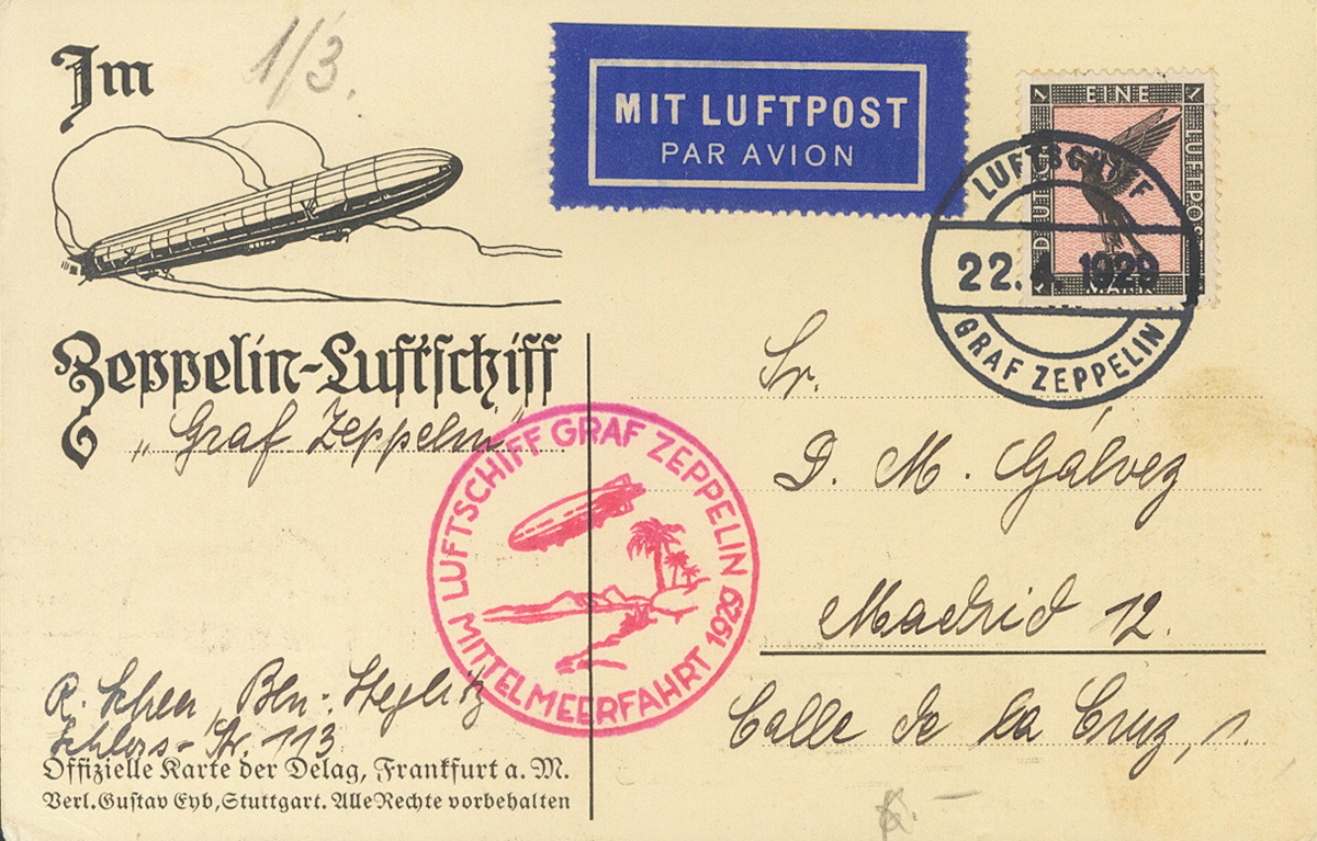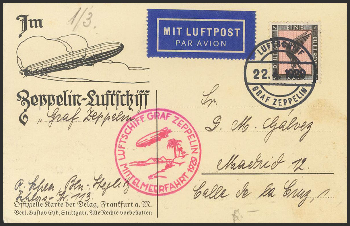Yvert 32. 1929. 1 m negro y rosa. Tarjeta Postal por Graf Zeppelin dirigida a MADRID. En el frente marca LUFTSCHIFF GRAF ZEPPELIN / MITTELMEERFAHRT, en carmÃn. MAGNIFICA.