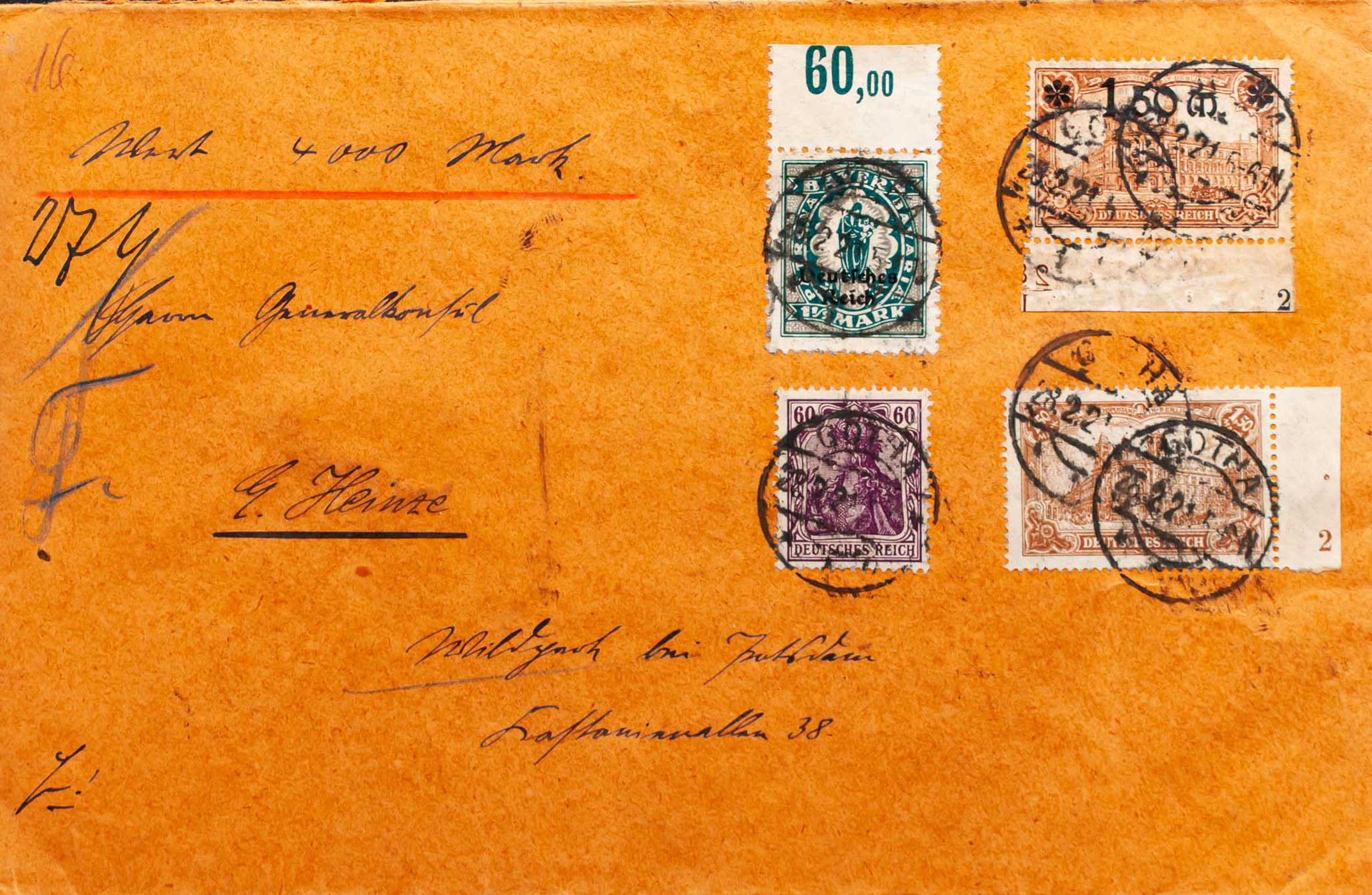 Yvert 114, 117, 118N, 90. 1921. 1´50 m castaño amarillo, 1´50 m sobre 1´50 m castaño amarillo, 1½ m verde y gris y 60 p lila. Certificado de GOTHA a WILDPARK. Al dorso llegada. MAGNIFICA.