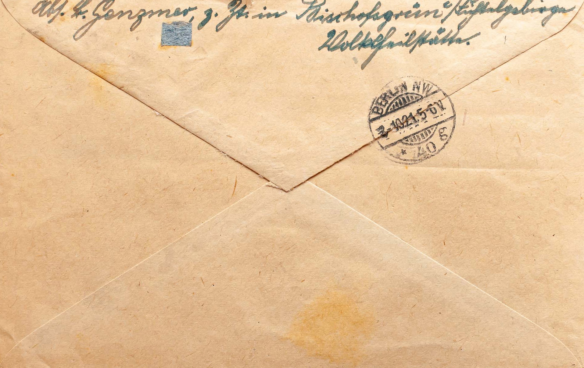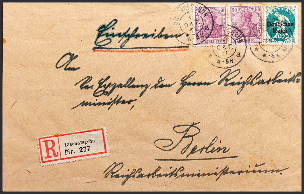 Yvert 124(2). 1921. 50 p lila, dos sellos y 60 p de Baviera (tonalizados). Certificado de BISCHOFSGRUN a BERLIN. Al dorso llegada. BONITA.