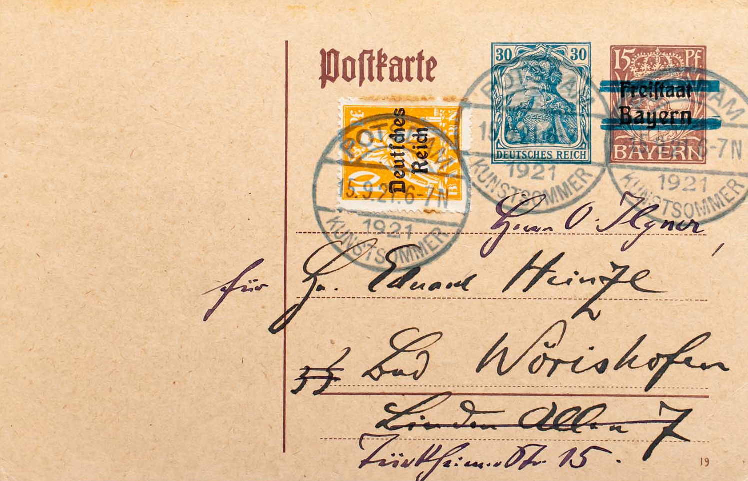 1921. 15 p castaño (Baviera) y 30 p azul (Germania) sobre Tarjeta Entero Postal de POTSDAM a BAD WORISHOFEN, con franqueo complementario de 10 p amarillo. Matasello POTSDAM / KUNSTSOMMER, en azul. MAGNIFICA.