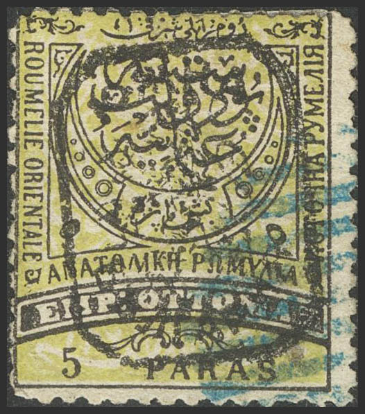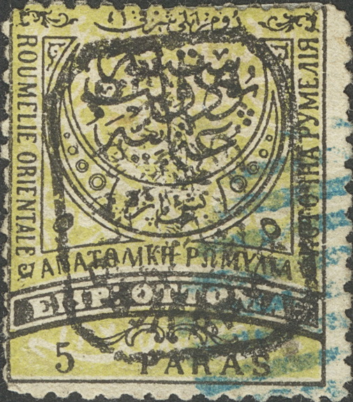 Yvert 9. 1885. 5 pa negro y oliva. Sobrecarga León encuadrada (Tipo I) y DENTADO 11½ (posiblemente procede de un sobre o tarjeta prefranqueado). BONITO. (Michel 21/IB)