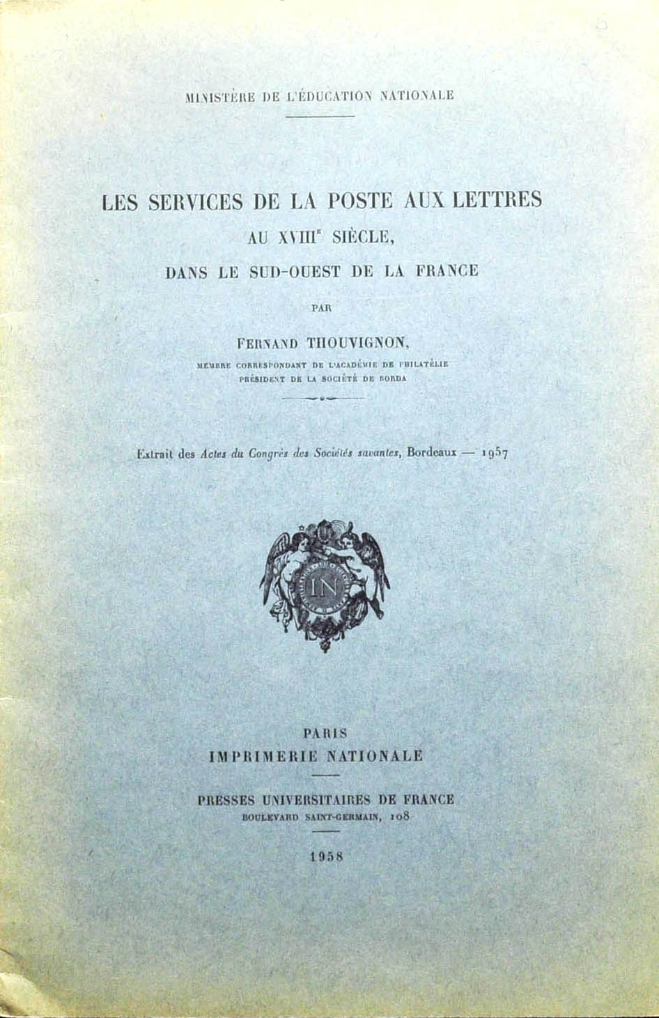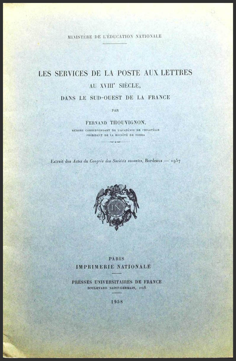 1958. LES SERVICES DE LA POSTE AUX LETTRES AU XVIII SIÉCLE, DANS LE SUD-OUEST DE LA FRANCE. Fernand Thouvignon. Ministerio de Educación Nacional. ParÃs, 1958.