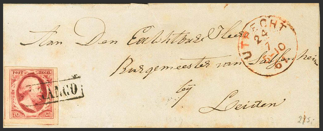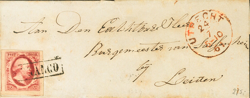 Yvert 2. 1861. 10 cts carmÃn. UTRECH a LEIDEN. Matasello FRANCO y en el frente fechador UTRECH, en rojo, al dorso lineal SASSENHEIM, en negro. MAGNIFICA.
