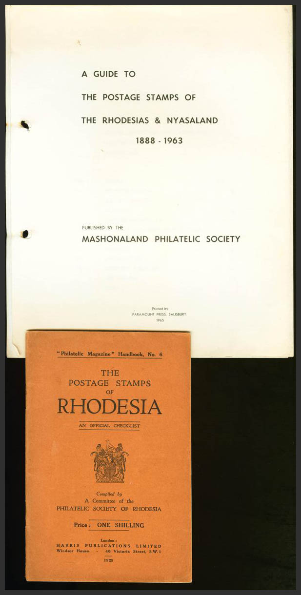 1965. A GUIDE TO THE POSTAGE STAMPS OF THE RHODESIAS AND NYASSALAND 1888-1963. Mashonaland Philatelic Society, 1965 (con actualización Nº2 y Nº3), incluye THE POSTAGE STAMPS OF RHODESIA. Philatelic Magazine Handbook Nº6. Harris Publications, 1925.