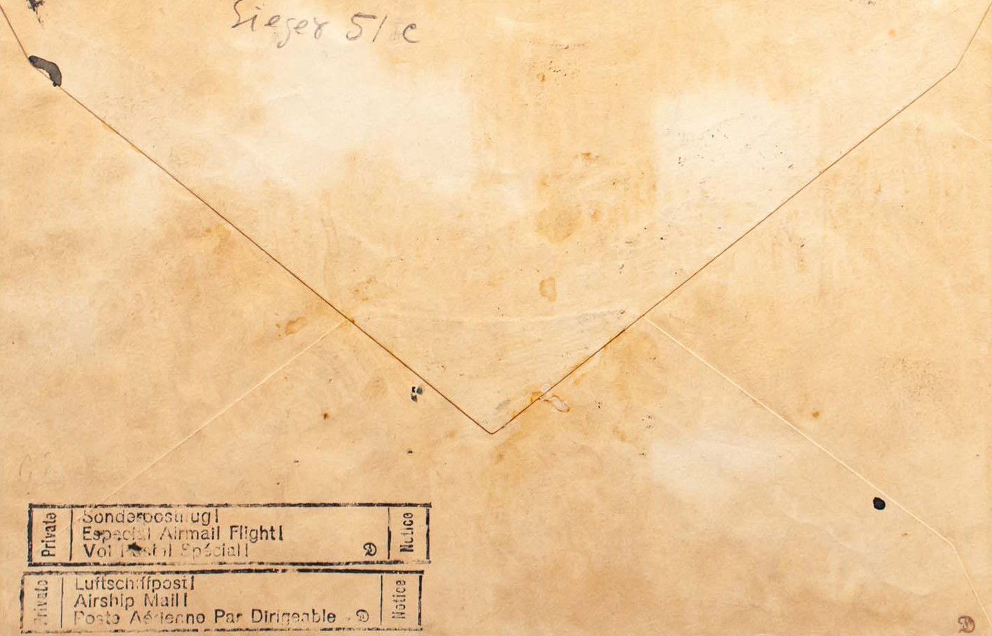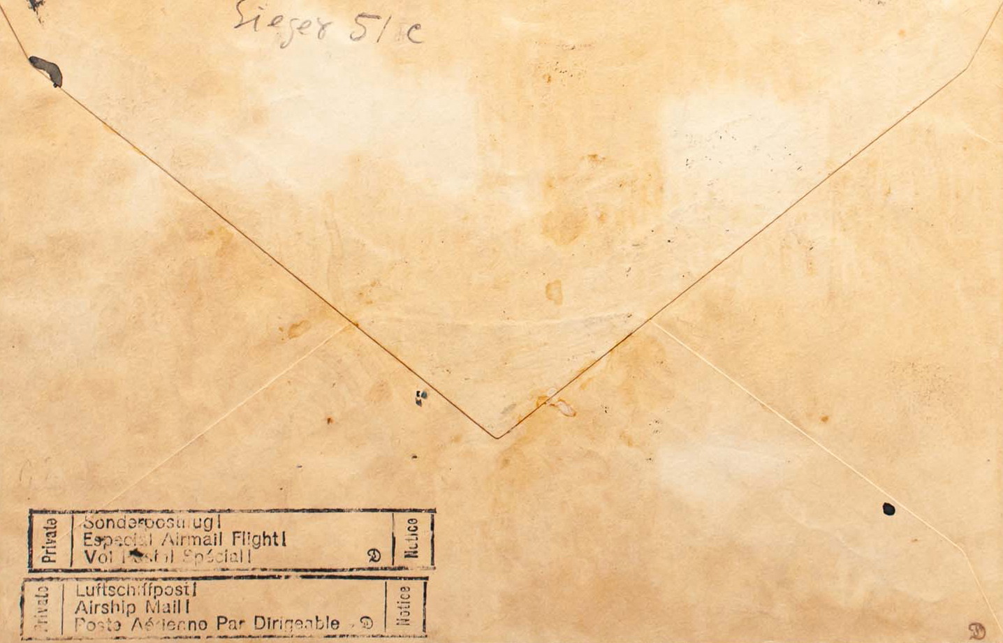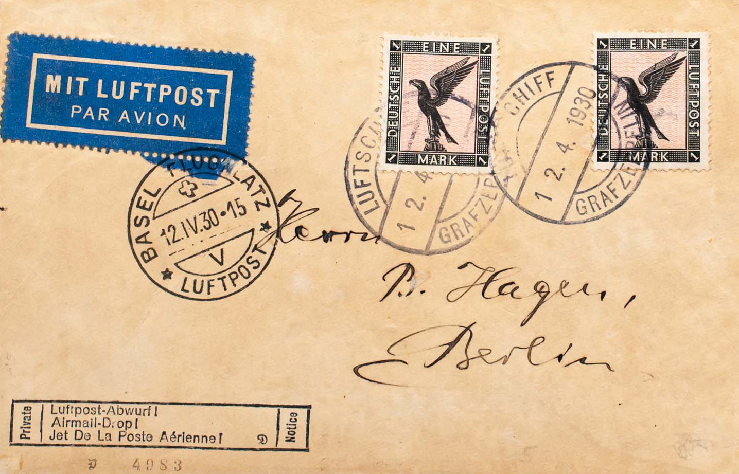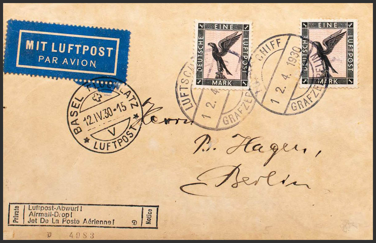 Yvert 32(2). 1930. 1 m negro y rosa, dos sellos. Graf Zeppelin dirigida a BERLIN. En el frente marca trilingüe de correo aéreo y fechador de lanzamiento BASEL FLUGPLATZ / LUFTPOST. MAGNIFICA Y RARA. (Sieger 51C)