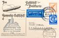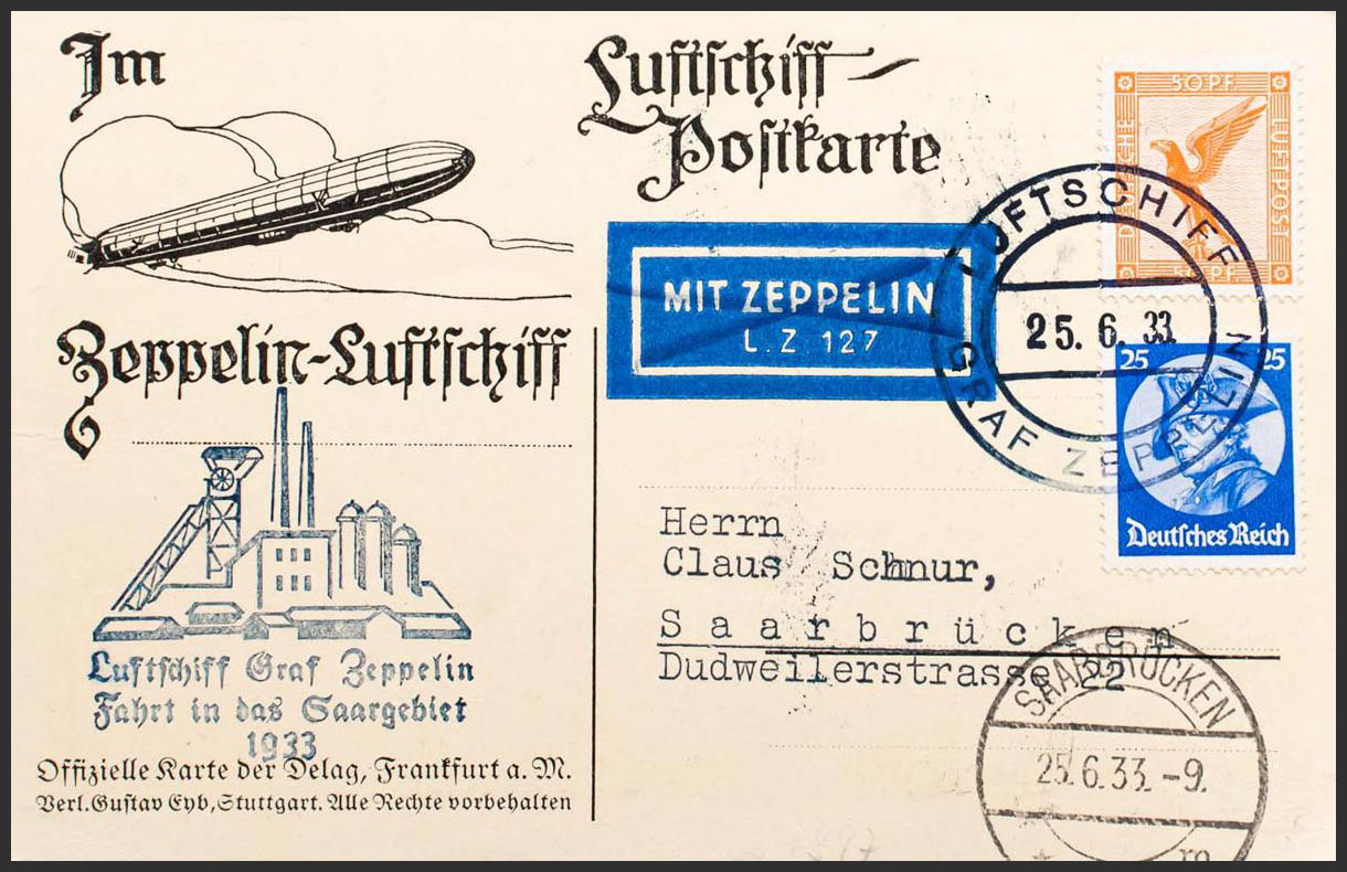 Yvert 469, Aéreo 31. 1933. 25 p ultramar y 50 p naranja. Tarjeta Postal por Graf Zeppelin dirigida a SARRE. En el frente marca LUFTSCHIFF GRAF ZEPPELIN / FAHRT IN DAS SAARGEBIET / 1933, en azul negro y llegada. MAGNIFICA Y RARA.