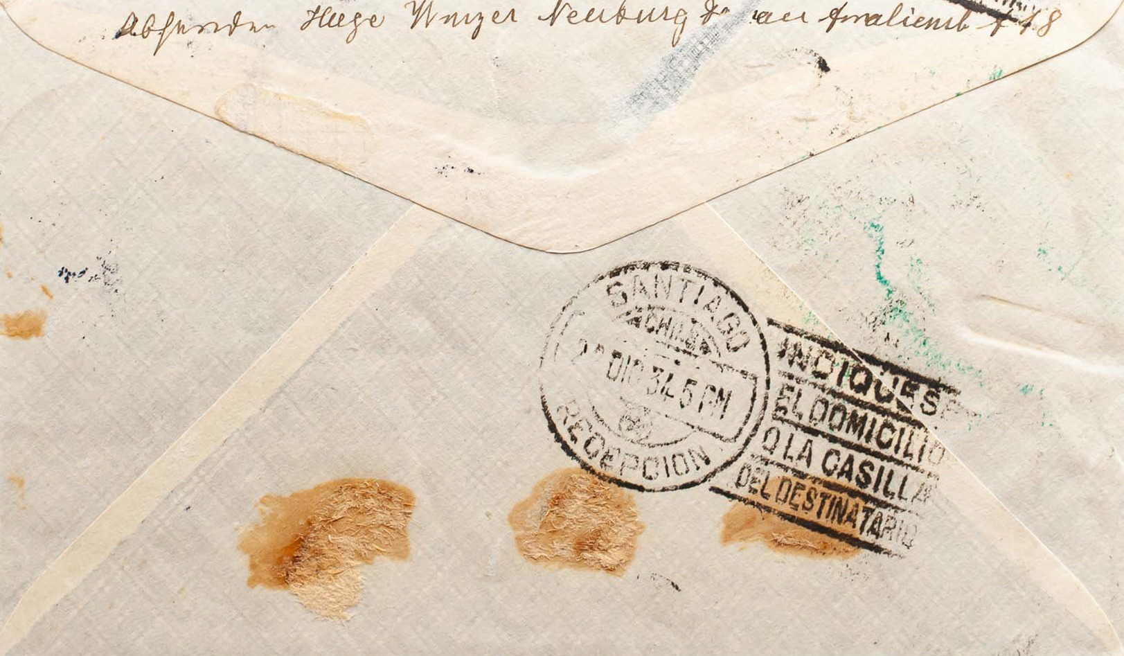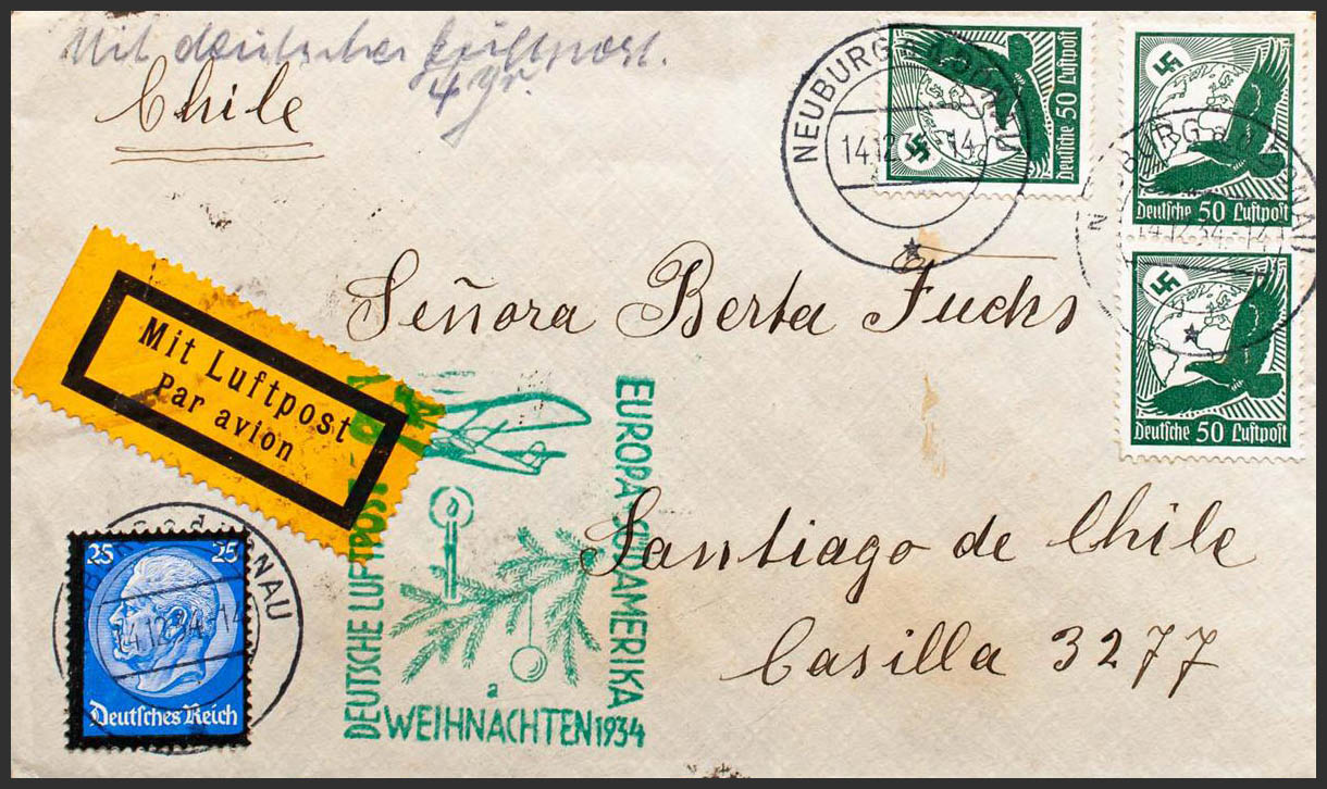 Yvert 49(3). 1934. 50 p verde, tres sellos y 25 p ultramar. Graf Zeppelin de NEUBURG a SANTIAGO DE CHILE. En el frente marca DEUTSCHE LUFTPOST / EUROPA-SÜDAMERICA / WEIHNACHTEN 1934, en verde y al dorso llegada. MAGNIFICA.