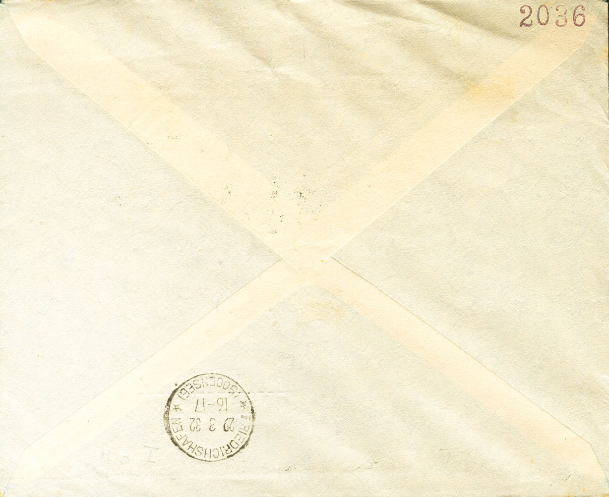 Yvert 4(2), 10. 1932. 18 ctvos violeta negro, dos sellos, 36 ctvos bistre y 12 ctvos azul. Sobre del NORD DEUTSCHER LLOYD BREMEN por Graf Zeppelin de BUENOS AIRES a DESSAU (ALEMANIA). En el frente marca SERVICIO AEREO TRANSATLANTICO / CONDOR-ZEPPELIN, en violeta y tránsito FRIEDRICHSHAFEN, al dorso. BONITA.