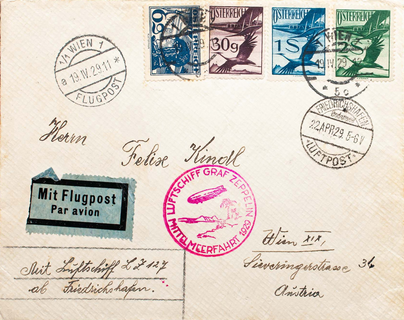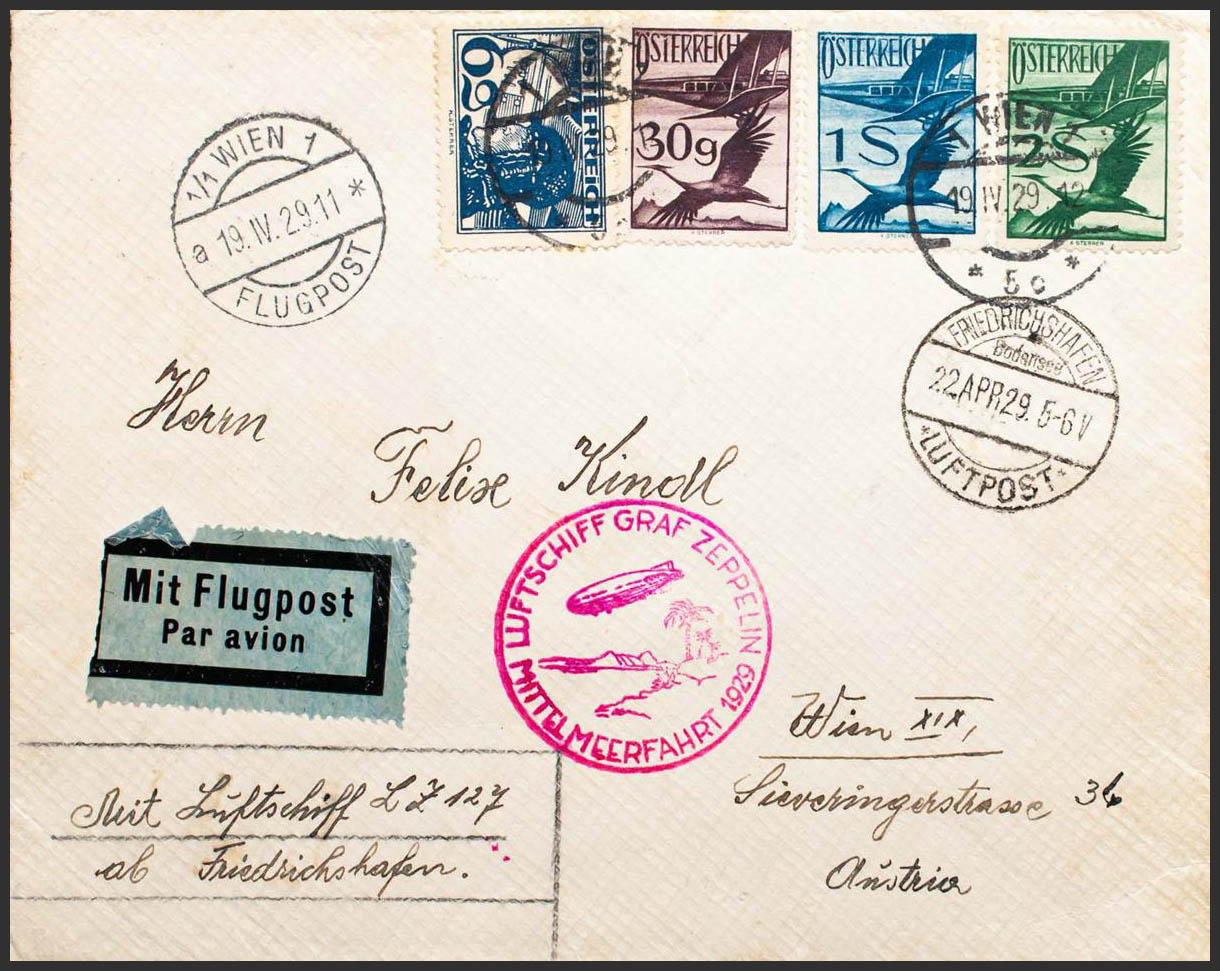 Yvert 14, 23, 27/28. 1929. 6 g azul, 30 g violeta, 1 s azul y 2 s verde. Graf Zeppelin dirigido a VIENA. En el frente marca LUFTSCHIFF GRAF ZEPPELIN / MITTELMEERFAHRT 1929, en rosa y fechador FRIEDRICHSHAFEN, al dorso tránsito SEVILLA. MAGNIFICA.