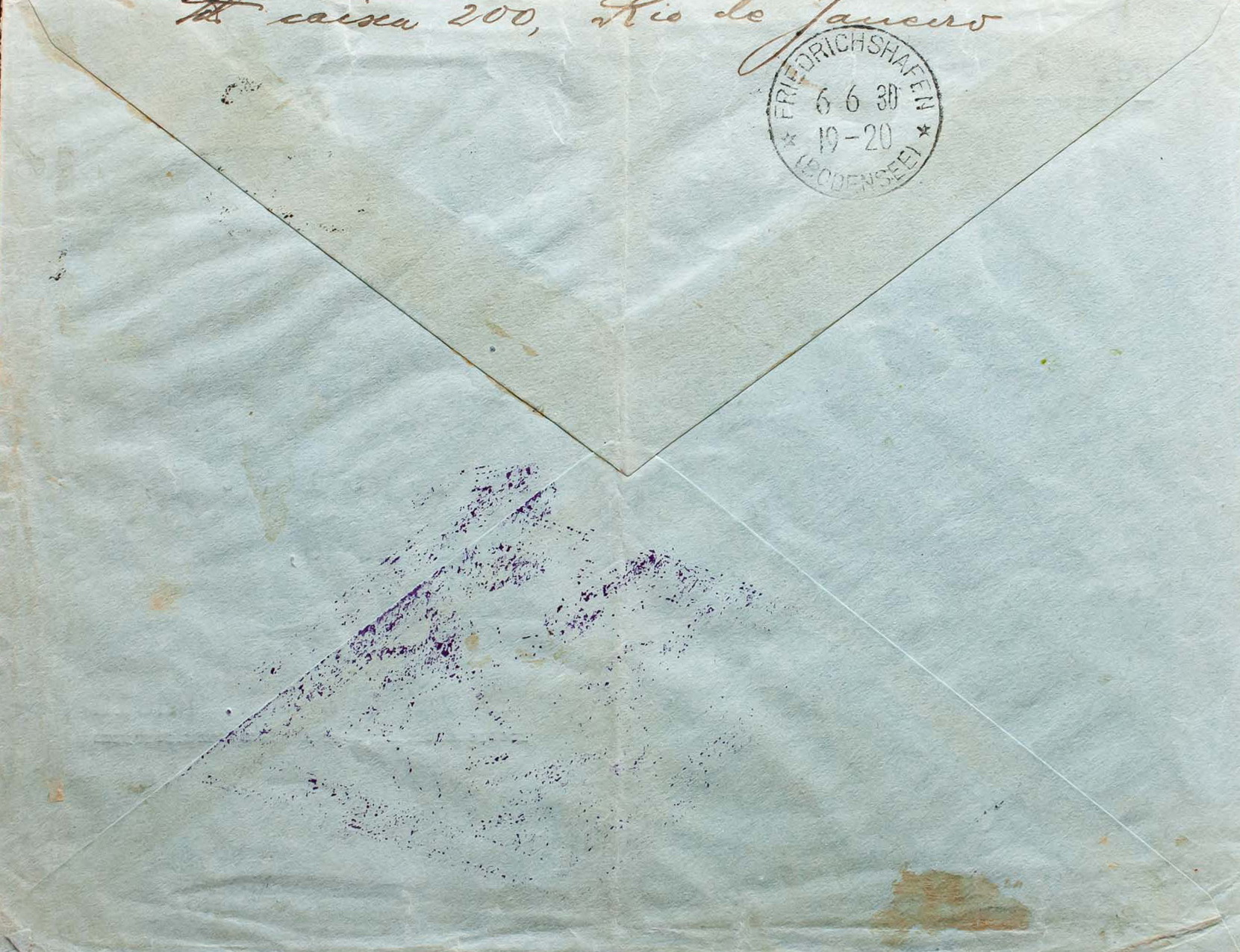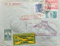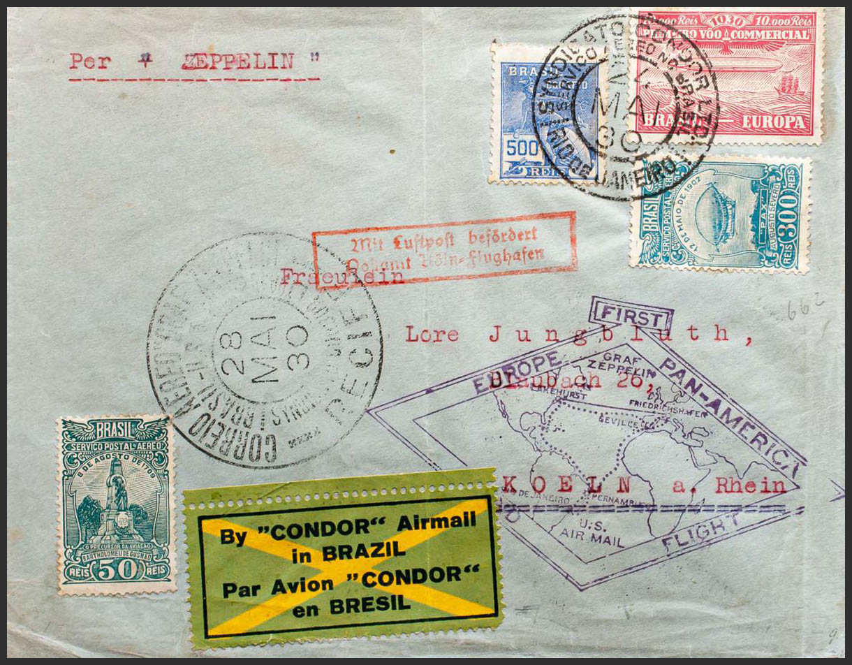 Yvert 205, Aéreo 17, 19, Cóndor 13. 1930. 50 reis verde azul, 300 reis azul, 500 reis ultramar y 10000 reis rosa carmín (Cóndor). Graf Zeppelin de RIO DE JANEIRO a COLONIA (ALEMANIA). En el frente marcas FIRST / EUROPE PANAMERICA / ROUND FLIGHT, en violeta, MIT LUFTPOST BEFORDERT / POSTAMT KOLN FLUGHAFEN, en rojo y etiqueta de la Compañía Cóndor y al dorso tránsito FRIEDRICHSHAFEN. MAGNIFICA.