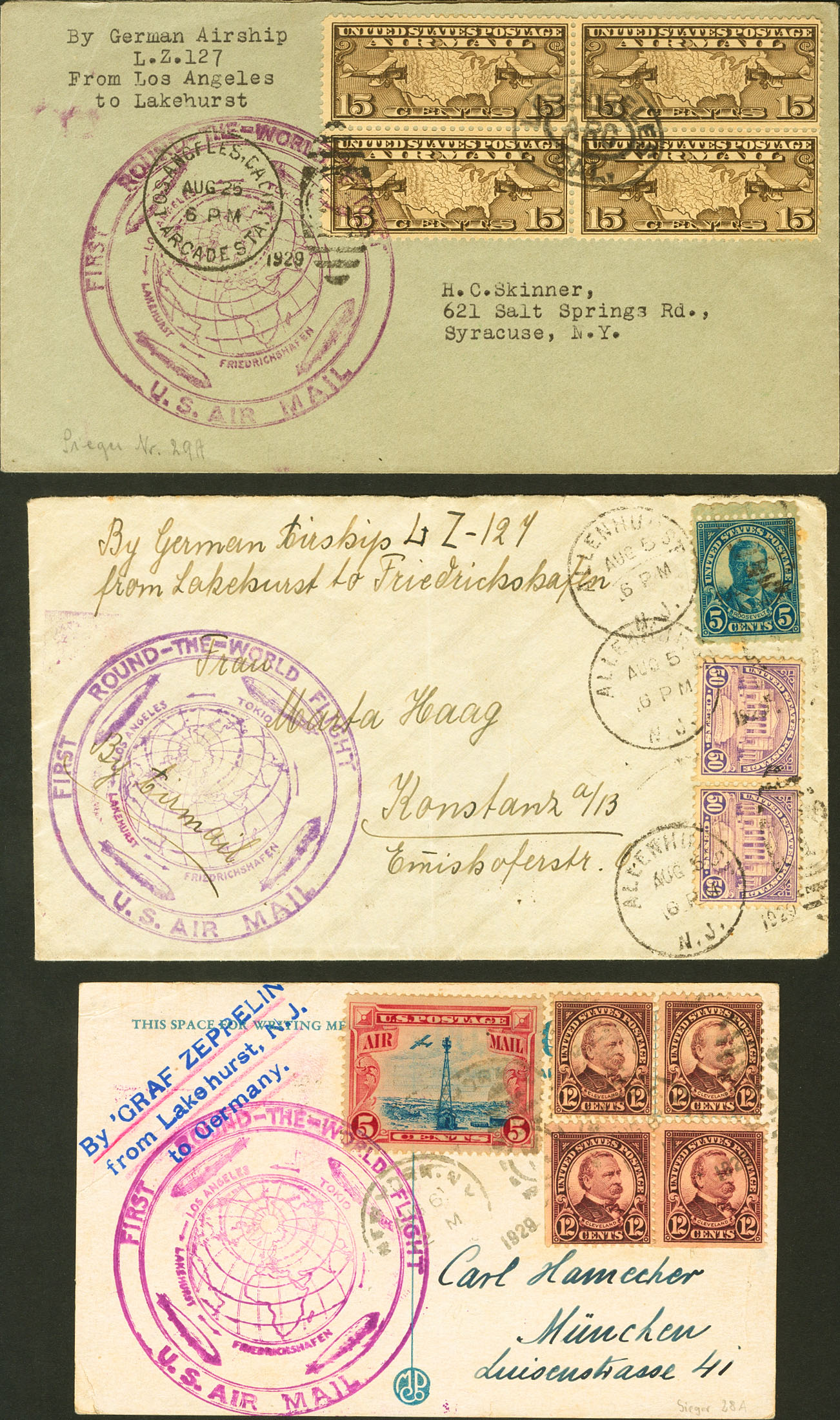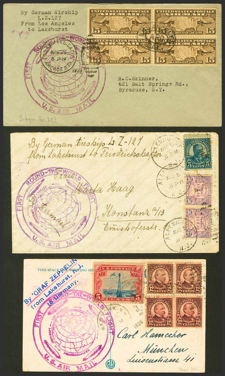 1929. Conjunto de tres cartas de ESTADOS UNIDOS dirigidas a Alemania (2) e interiormente (1), todas con marca FIRST ROUND-THE-WORLD FLIGHT / U.S. AIR MAIL, en violeta. MAGNIFICAS.
