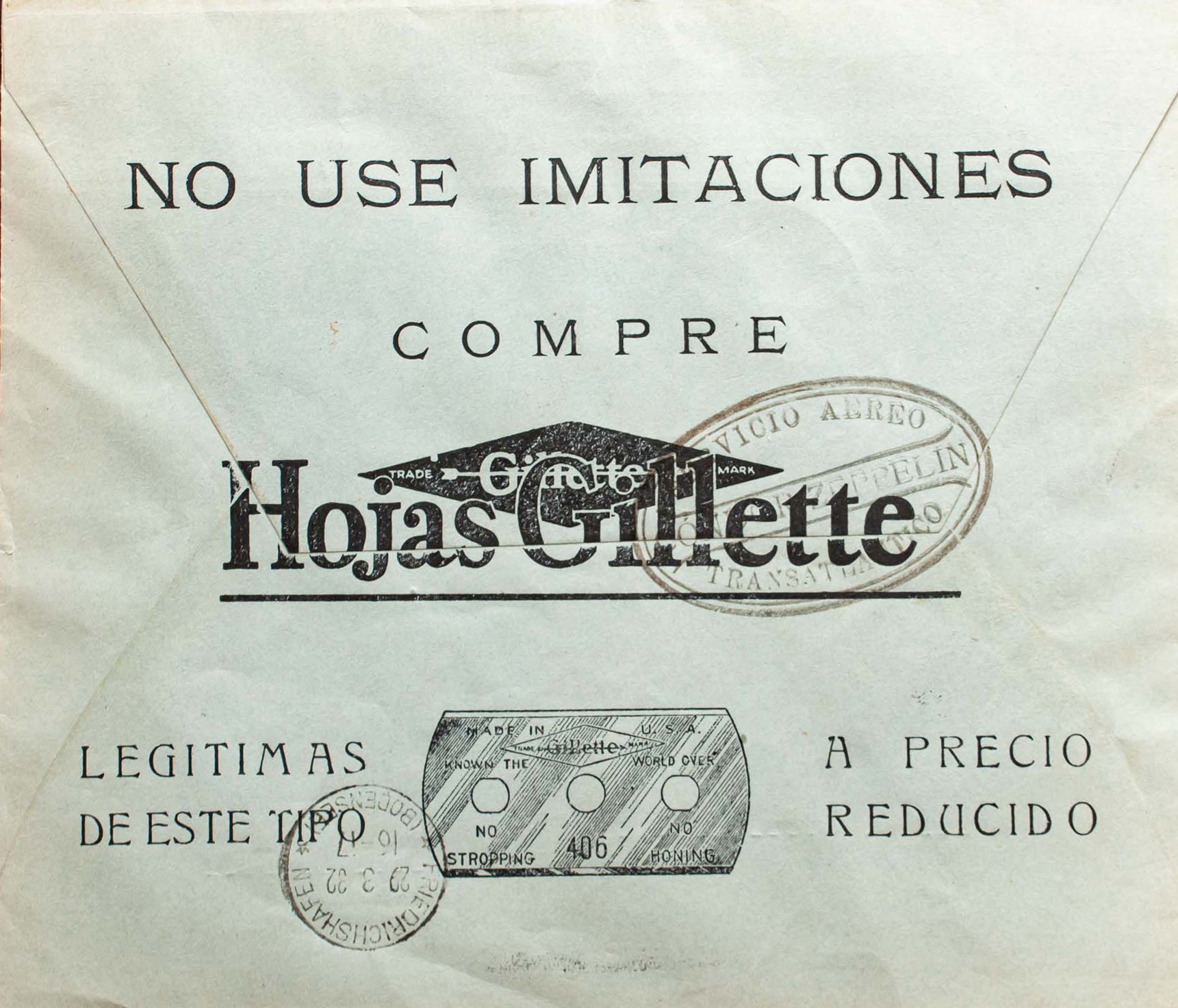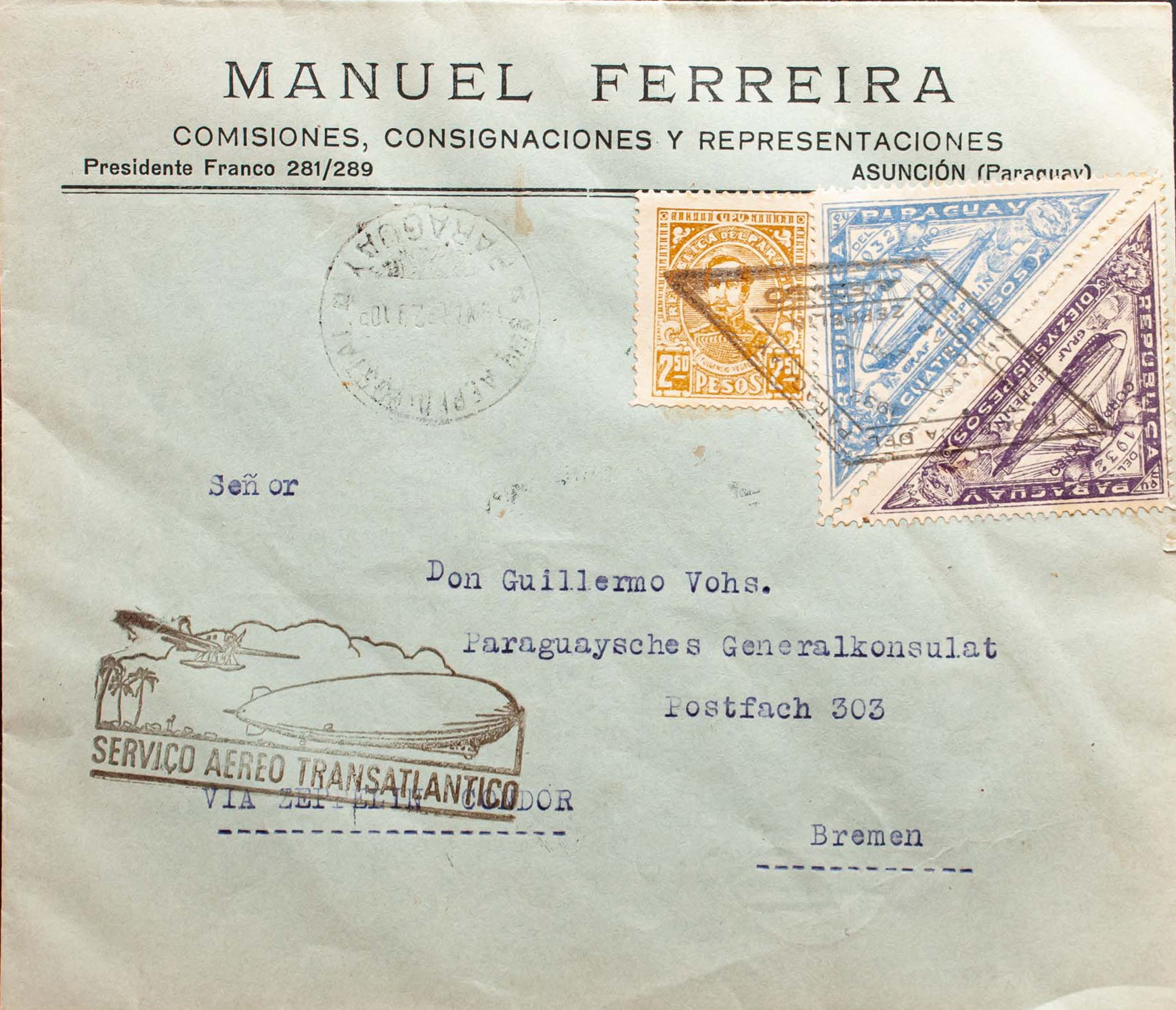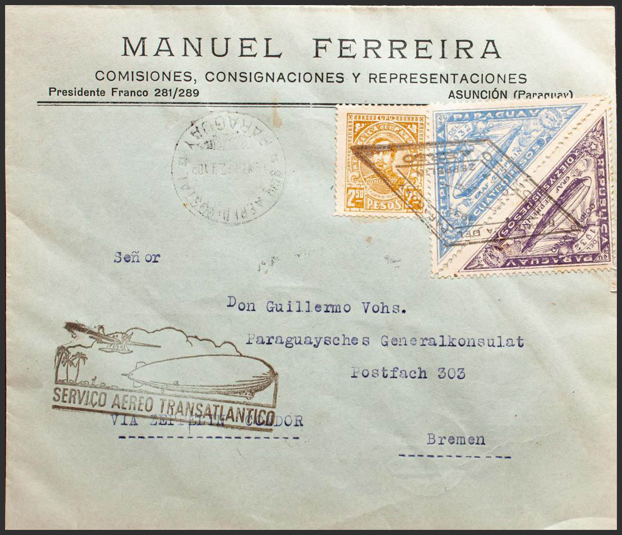 1932. 4 p ultramar, 16 p lila y 2´50 pesos. Graf Zeppelin de ASUNCION a BREMEN (ALEMANIA). Matasello romboidal REPUBLICA DEL PARAGUAY / GRAF ZEPPELIN, en negro y en el frente marca SERVIÇO AEREO TRANSATLANTICO. MAGNIFICA.