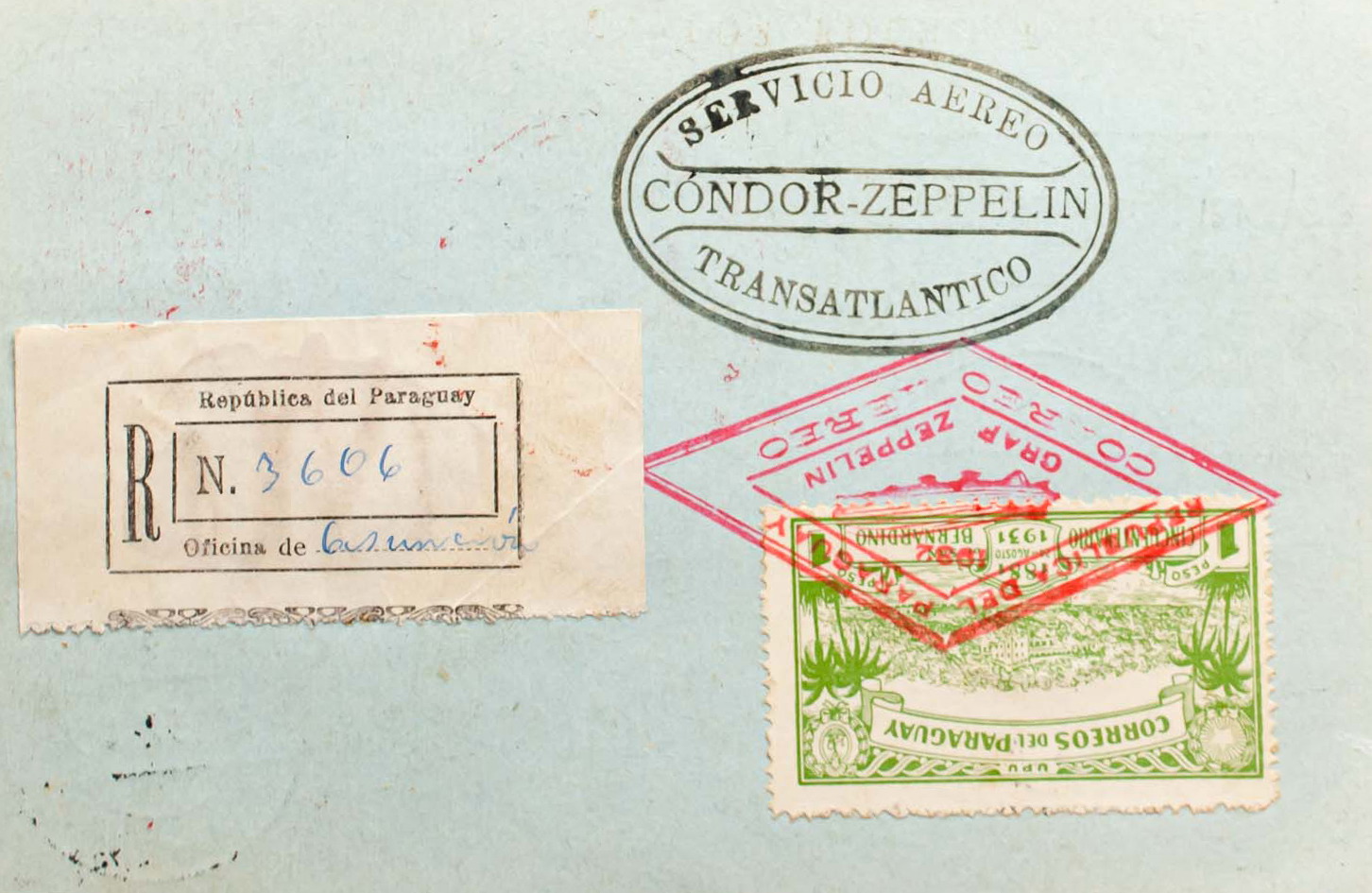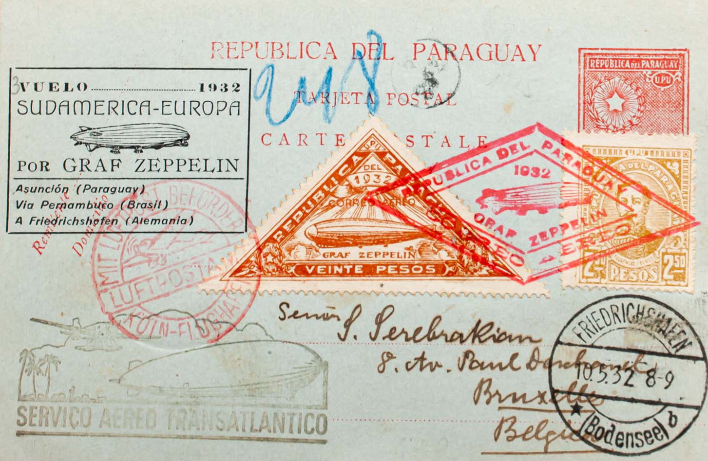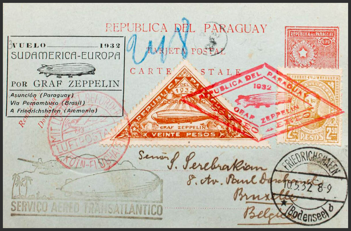Yvert 330, 274, Aéreo 55. 1932. 70 ctvos carmÃn sobre Tarjeta Entero Postal Graf Zeppelin de ASUNCION a BRUSELAS (BELGICA), con franqueo complementario de 2´50 p bistre, 1 p verde (al dorso) y aéreo 20 p castaño amarillo. Matasello romboidal GRAF ZEPPELIN, en rojo y en el frente marca SERVIÇO AEREO TRANSATLANTICO y tránsitos por COLONIA y FRIEDRICHSHAFEN. MAGNIFICA.