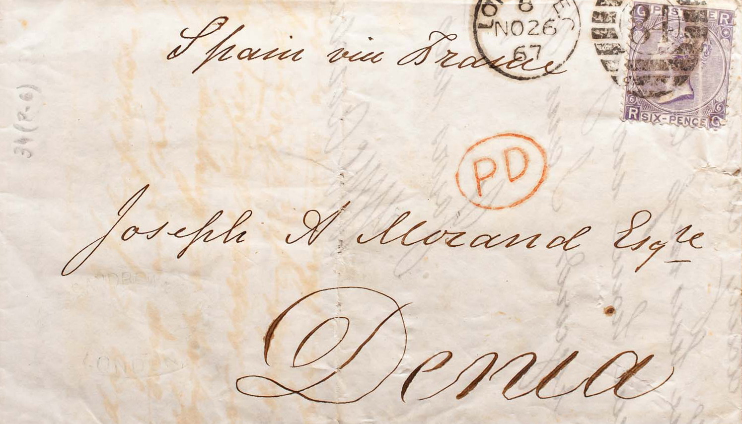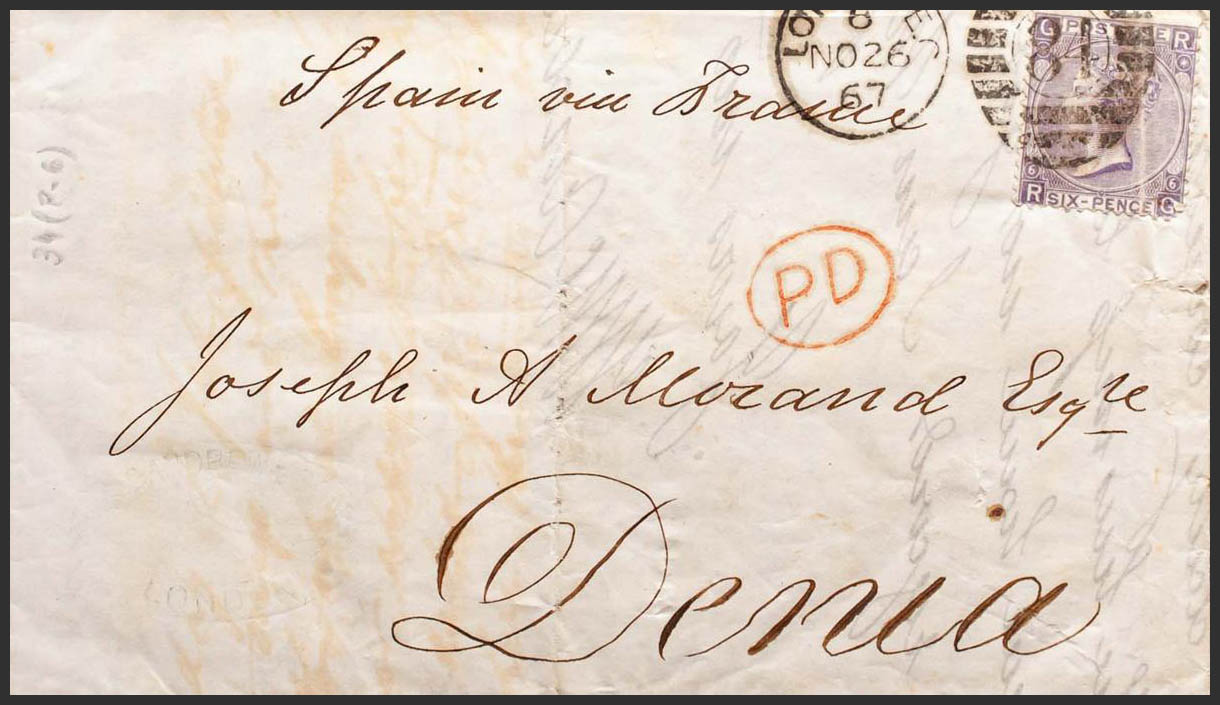34. 1867. 6 p lila (Plancha 6). LONDRES a DENIA (pliegue archivo). Matasello duplex LONDON / 84. BONITA.