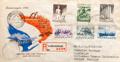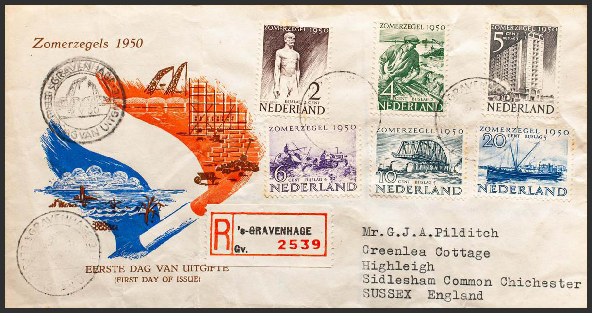Yvert 352/40. 1950. Serie completa (algún valor tonalizado). Sobre del Primer DÃa Certificado de LA HAYA a HIGHLEIGH (GRAN BRETAÑA). Al dorso llegada. BONITA.