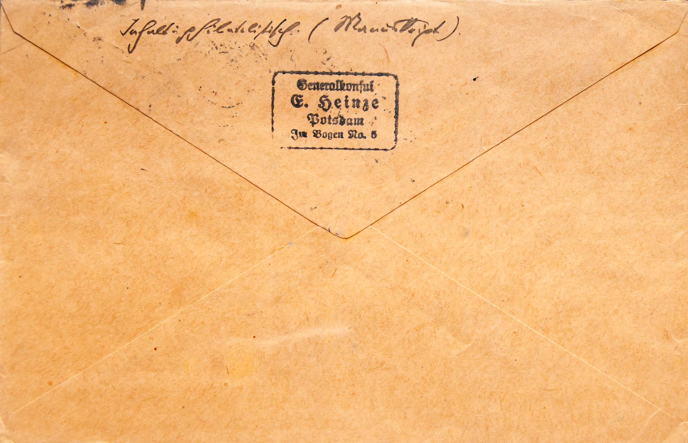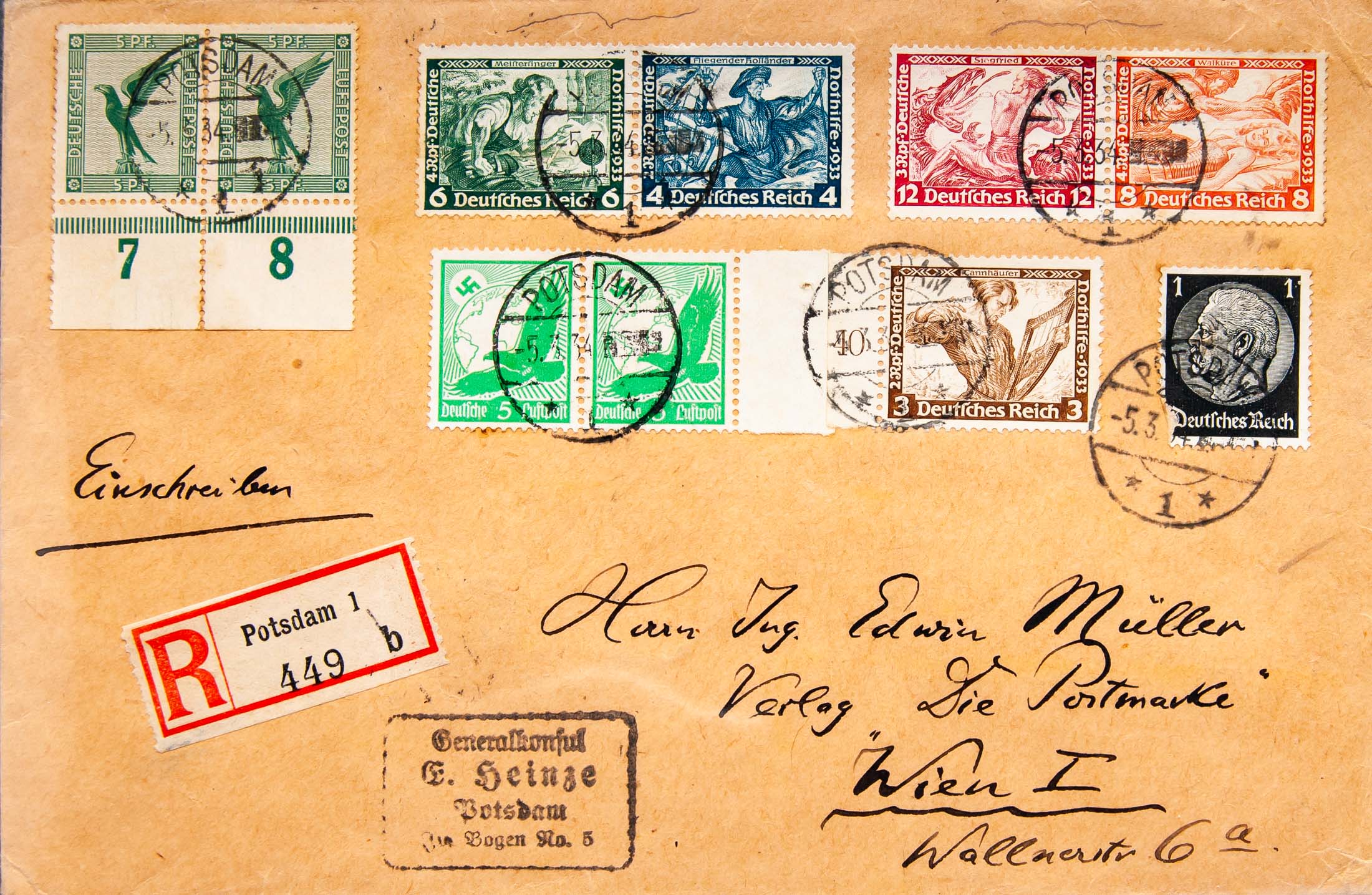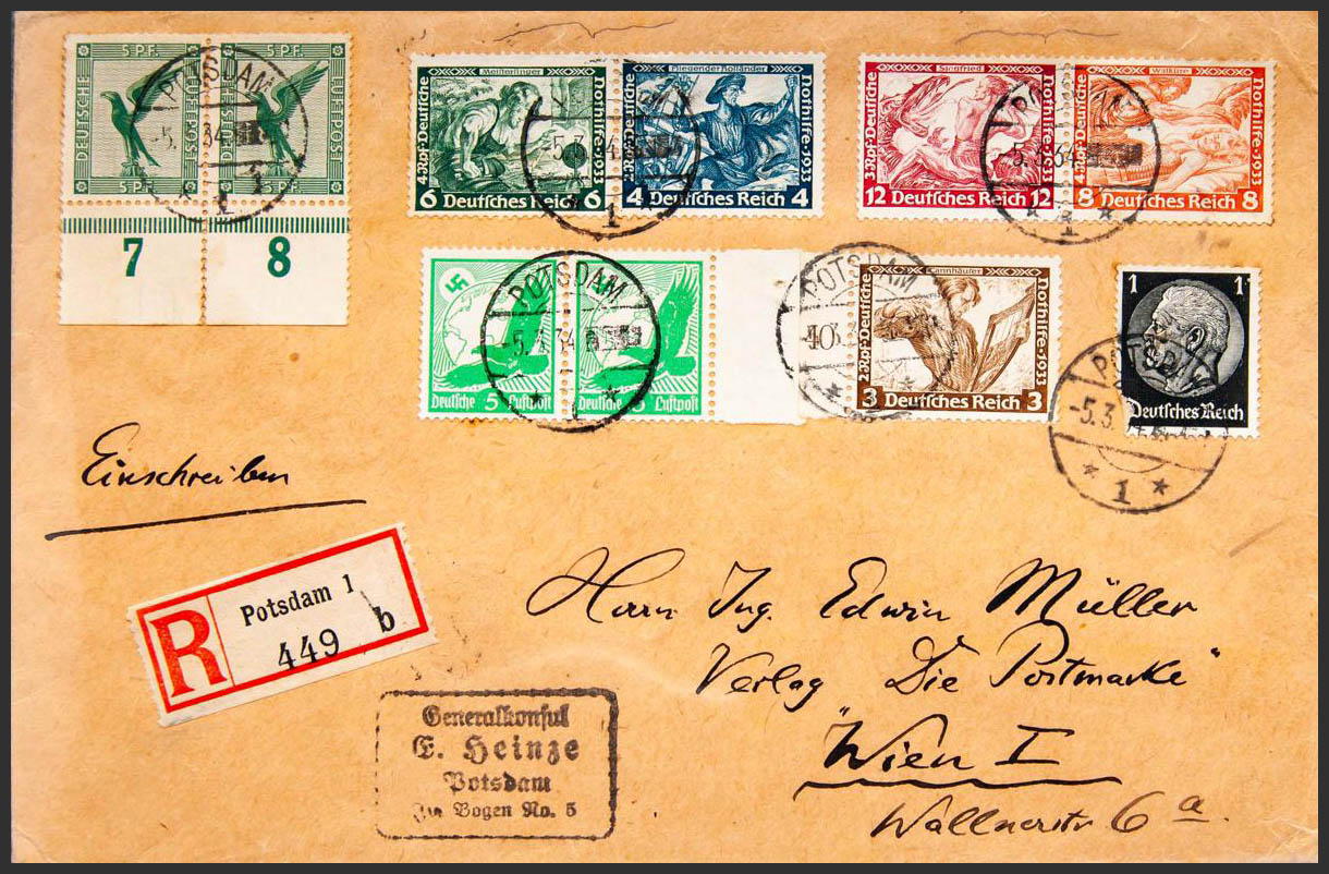 Yvert 470, 471, 473, 474, 475. 1934. 3 p castaño, 4 p y 6 p unidos, 8 p y 12 p unidos, 1 p negro (defecto de origen) y 5 p verde, dos sellos. Certificado de POTSDAM a VIENA (AUSTRIA). BONITA Y ESPECTACULAR FRANQUEADA.
