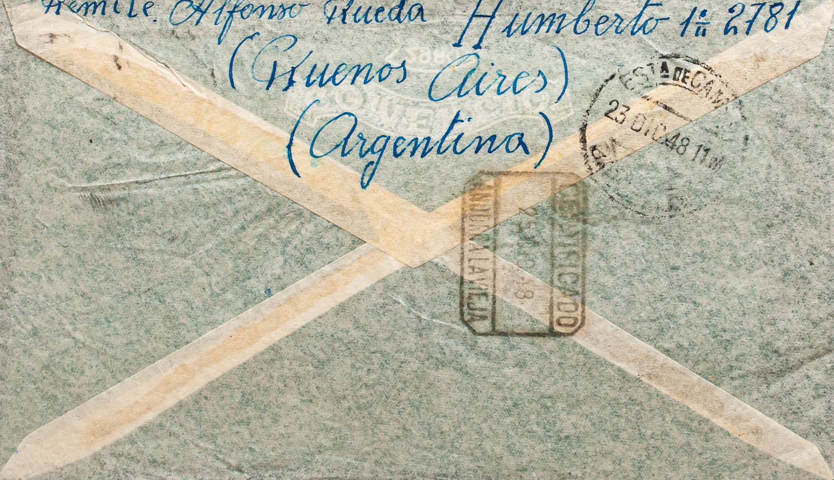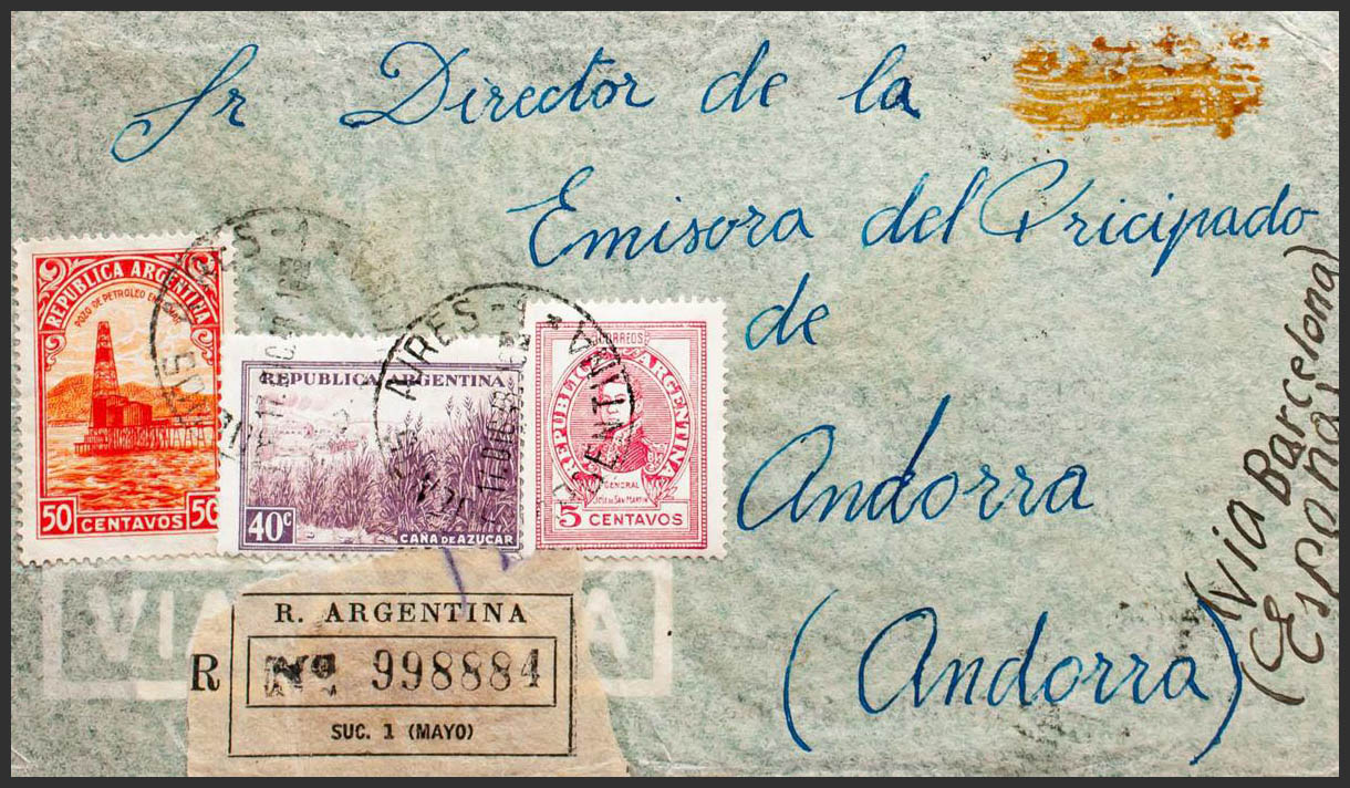 Yvert 462, 452A, 453. 1948. 5 ctvos rosa, 40 ctvos lila y 50 ctvos naranja y amarillo. Certificado de BUENOS AIRES a ANDORRA. Al dorso llegada. MAGNIFICA Y RARO DESTINO.