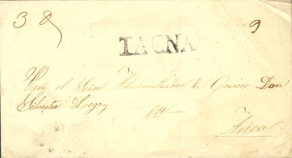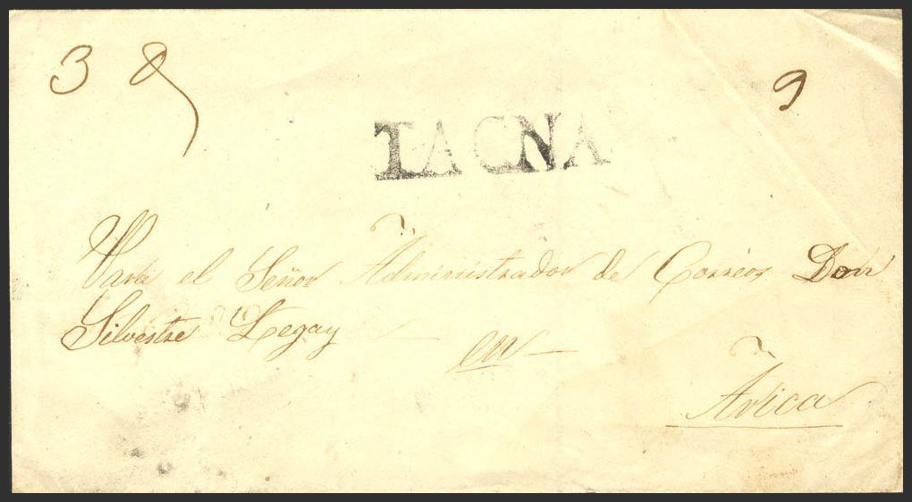 (1830ca). TACNA a ATICA. Marca TACNA, en rojo (Colareta 2). MAGNIFICA.