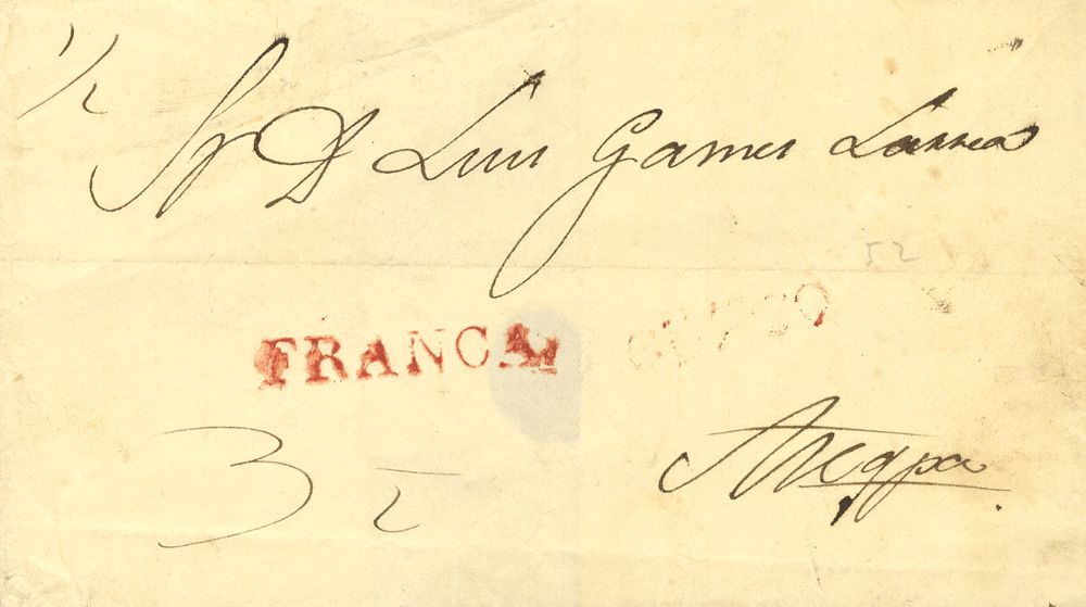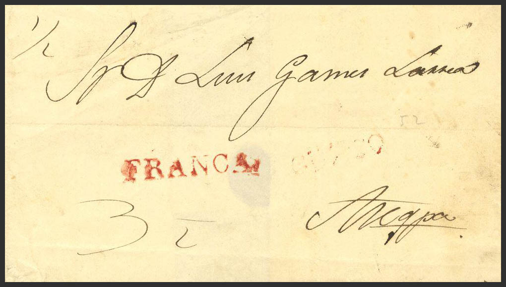 (1832ca). CUZCO a AREQUIPA. Marca CUZCO, en rojo débilmente estampada (Colareta 5) y FRANCA, en rojo (Colareta 6f). RARA.