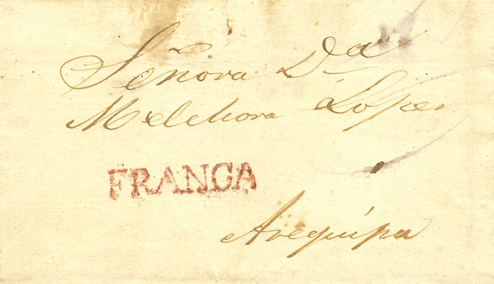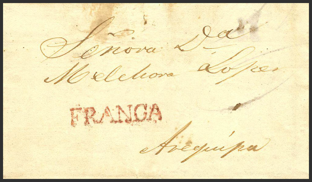 1836. MOQUEGUA a AREQUIPA. Marca FRANCA, en rojo (Colareta 2f). MAGNIFICA.