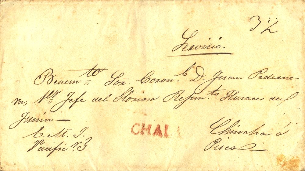 (1832ca). CHALA a CHINCHA. Marca CHALA, en rojo (Colareta 1). MAGNIFICA.