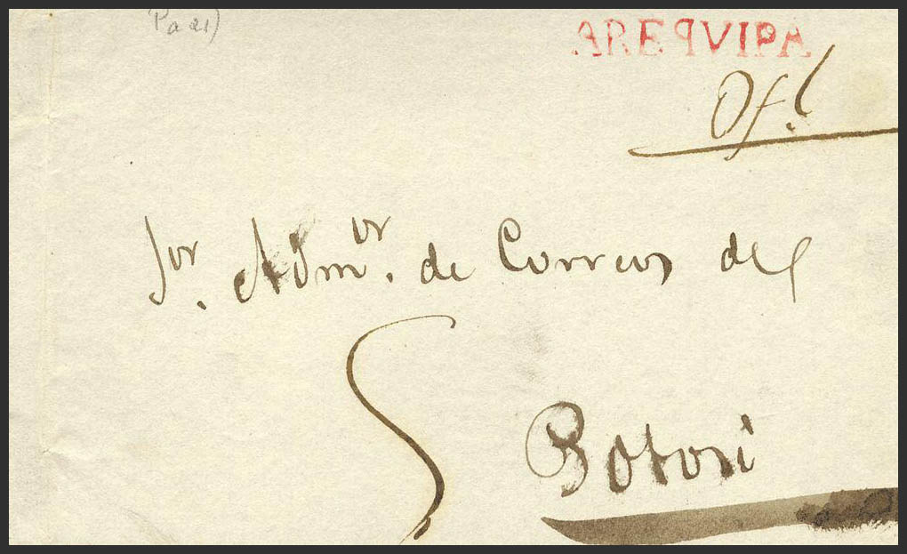 1828. (1828 ca). Frontal de AREQUIPA a POTOSI. Marca AREQVIPA, en rojo (Colareta 4). RARA.