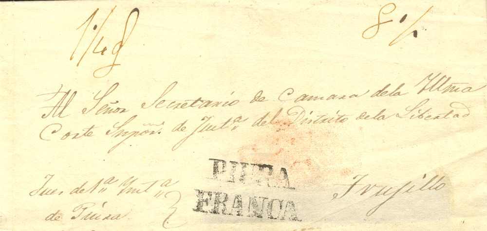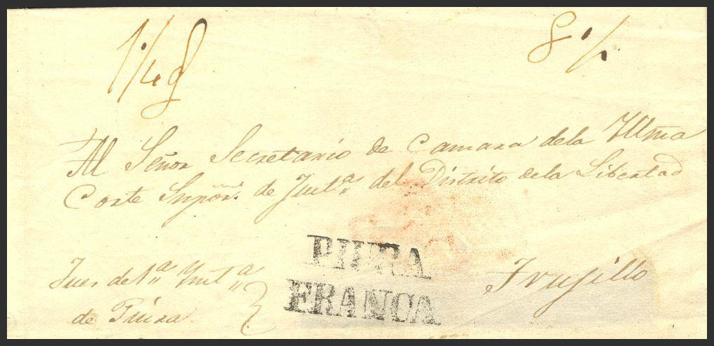 (1857ca). PIURA a TRUJILLO. Marca PIURA / FRANCA (Colareta 6f). MAGNIFICA Y RARA.