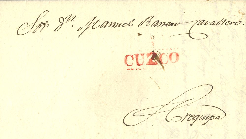 1834. CUZCO a AREQUIPA. Marca CUZCO, en rojo (Colareta 7). MAGNIFICA Y RARA.