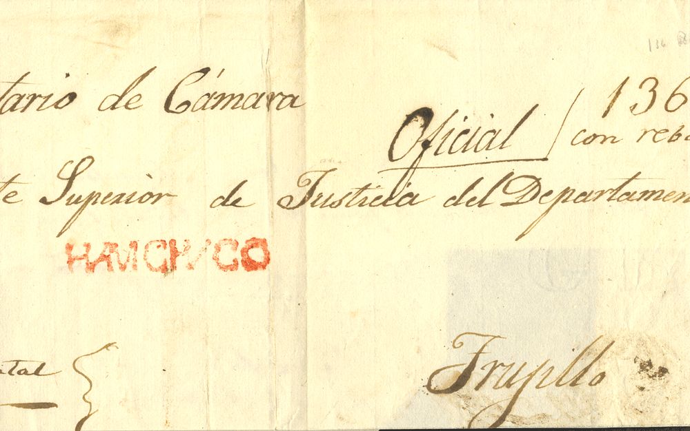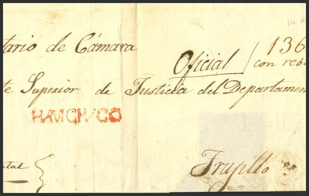 1851. HUAMACHUCO a TRUJILLO. Marca HUAMACHUCO, en rojo (Colareta 1). MAGNIFICA Y RARA.